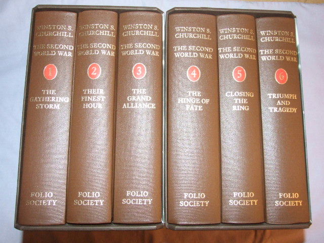 Churchill, Winston S - The Second World War in Six Volumes (Published in by The Folio Society in 2000. Vol. 1 The Gathering Storm, Vol. 2 Their Finest Hour, Vol. 3 The Grand Alliance, Vol. 4 The Hinge of Fate, Vol. 5 Closing the Ring and Vol. 6 Triumph and Tragedy, illustrated with maps, charts and black and white photographic illustrations. )