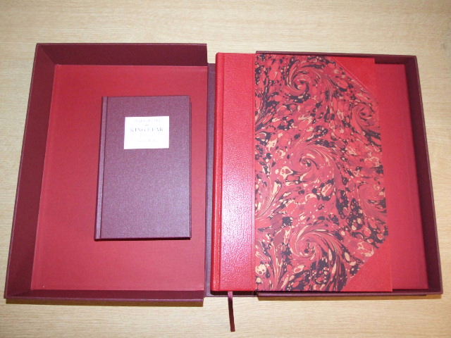 Shakespeare, William - The Letterpress King Lear Limited Edition (Published in by The Folio Society in 2007. Solander box. Boxed Letterpress edition. Numbered copy of 3750 numbered copies. A Letterpress edition of Shakespeare's play, created with the highest quality materials and craftsmanship. Quarter-bound in goatskin leather, blocked in gold with hand-marbled paper sides; gilded top edge and ribbon marker. Set in 16pt 'Monotype' Baskerville, printed by letterpress on mould-made paper. Presented with a commentary volume which includes the text of the play and full explanatory notes. Supplied in a buckram-bound solander box measuring 15" x 11" x 2.75". Letterpress volume: 14" x 10.75". Commentary volume: bound in buckram. 8.75" x 5.75". A pleasure to read Shakespeare's glorious language lies at the heart of his plays and here, free from the clutter of notes, every line is given the appropriate space to breathe. The text is printed by letterpress, a method now used only for the very finest private press publishing. Meticulously set on a traditional monotype machine, rather than a computer, the type letters have been individually created from hot metal in the rarely used 16-point font of 'Monotype' Baskerville. The shape of each line, and the arrangement of lines on the page, are adjusted by hand to create the most pleasing overall effect for the reader. The layout of words on a printed page is as much an art as such ancient techniques as Chinese or Arabic calligraphy. Here, the text is designed by eye and set on a manual machine, not a computer. Each letter of type has been created from hot metal in the rarely used 16-point font of 'Monotype' Baskerville, chosen for its clarity and elegance of form. Tiny irregularities testify to the hand-crafted nature of the process, since the shape of each line, the very gap between letters, is adjusted by hand to create the most pleasing overall effect. A book is a pleasure of many senses: the feel of it in the hands, even the smell of the leather and ink all contribute to the enjoyment. Running your fingers over the paper, the difference between letterpress and litho printing is instantly discernable. You can feel the indentation where each letter has been impressed into the mould-made paper. This high quality paper is made from cotton rags and wood fibres dried on a cylindrical mould which produces the feathered edge known as the 'deckle'. The quarter-binding is of finest goatskin leather, dyed to a rich colour. The pattern on the hand-marbled paper sides is unique to each volume. The craftsmen and women who work on these volumes are rightly proud of their involvement in the project. From the hand-sewing of the pages to the blocking of each label in 24-carat gold, few books have had such care lavished on them. You can be confident that these exceptional editions will give pleasure for generations to come. Unmatched in comedy and tragedy, poetry and prose, Shakespeare's plays are the crowning jewel of the English language. The creation of beautiful reading editions worthy of their stature is a dream that all lovers of his works will understand – a dream realised in The Folio Society's Letterpress Shakespeare series. Here, Shakespeare's words are given the space and setting they deserve. The meticulously designed pages and the clear and elegant type entice the eye to read, whilst the leather quarterbindings, gilded top edges and hand-marbled paper sides make these volumes a pleasure to look at and a delight to own. )