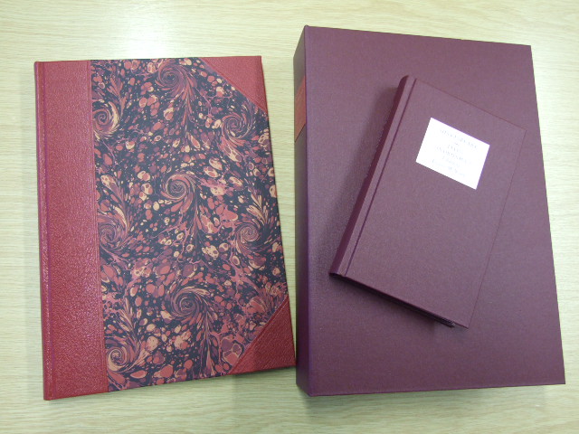 Shakespeare, William - The Letterpress Titus Andronicus Limited Edition (Published in by The Folio Society in 2008. Solander box. Boxed Letterpress edition. Limited Edition of 3750 numbered copies. A Letterpress edition of Shakespeare's play, created with the highest quality materials and craftsmanship. Quarter-bound in goatskin leather, blocked in gold with hand-marbled paper sides; gilded top edge and ribbon marker. Set in 16pt 'Monotype' Baskerville, printed by letterpress on mould-made paper. Presented with a commentary volume which includes the text of the play and full explanatory notes. Supplied in a buckram-bound solander box measuring 15" x 11" x 2.75". Letterpress volume: 14" x 10.75". Commentary volume: bound in buckram. 8.75" x 5.75". A pleasure to read Shakespeare's glorious language lies at the heart of his plays and here, free from the clutter of notes, every line is given the appropriate space to breathe. The text is printed by letterpress, a method now used only for the very finest private press publishing. Meticulously set on a traditional monotype machine, rather than a computer, the type letters have been individually created from hot metal in the rarely used 16-point font of 'Monotype' Baskerville. The shape of each line, and the arrangement of lines on the page, are adjusted by hand to create the most pleasing overall effect for the reader. The layout of words on a printed page is as much an art as such ancient techniques as Chinese or Arabic calligraphy. Here, the text is designed by eye and set on a manual machine, not a computer. Each letter of type has been created from hot metal in the rarely used 16-point font of 'Monotype' Baskerville, chosen for its clarity and elegance of form. Tiny irregularities testify to the hand-crafted nature of the process, since the shape of each line, the very gap between letters, is adjusted by hand to create the most pleasing overall effect. A book is a pleasure of many senses: the feel of it in the hands, even the smell of the leather and ink all contribute to the enjoyment. Running your fingers over the paper, the difference between letterpress and litho printing is instantly discernable. You can feel the indentation where each letter has been impressed into the mould-made paper. This high quality paper is made from cotton rags and wood fibres dried on a cylindrical mould which produces the feathered edge known as the 'deckle'. The quarter-binding is of finest goatskin leather, dyed to a rich colour. The pattern on the hand-marbled paper sides is unique to each volume. The craftsmen and women who work on these volumes are rightly proud of their involvement in the project. From the hand-sewing of the pages to the blocking of each label in 24-carat gold, few books have had such care lavished on them. You can be confident that these exceptional editions will give pleasure for generations to come. Unmatched in comedy and tragedy, poetry and prose, Shakespeare's plays are the crowning jewel of the English language. The creation of beautiful reading editions worthy of their stature is a dream that all lovers of his works will understand – a dream realised in The Folio Society's Letterpress Shakespeare series. Here, Shakespeare's words are given the space and setting they deserve. The meticulously designed pages and the clear and elegant type entice the eye to read, whilst the leather quarterbindings, gilded top edges and hand-marbled paper sides make these volumes a pleasure to look at and a delight to own. )