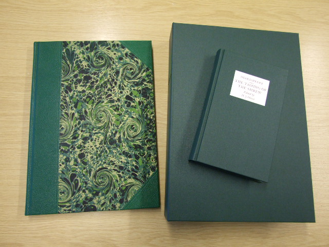 Shakespeare, William - The Letterpress The Taming of the Shrew Limited Edition (Published in by The Folio Society in 2010. Solander box. Boxed Letterpress edition. Limited Edition of 1000 numbered copies. A Letterpress edition of Shakespeare's play, created with the highest quality materials and craftsmanship. Quarter-bound in goatskin leather, blocked in gold with hand-marbled paper sides; gilded top edge and ribbon marker. Set in 16pt 'Monotype' Baskerville, printed by letterpress on mould-made paper. Presented with a commentary volume which includes the text of the play and full explanatory notes. Supplied in a buckram-bound solander box measuring 15" x 11" x 2.75". Letterpress volume: 14" x 10.75". Commentary volume: bound in buckram. 8.75" x 5.75". A pleasure to read Shakespeare's glorious language lies at the heart of his plays and here, free from the clutter of notes, every line is given the appropriate space to breathe. The text is printed by letterpress, a method now used only for the very finest private press publishing. Meticulously set on a traditional monotype machine, rather than a computer, the type letters have been individually created from hot metal in the rarely used 16-point font of 'Monotype' Baskerville. The shape of each line, and the arrangement of lines on the page, are adjusted by hand to create the most pleasing overall effect for the reader. The layout of words on a printed page is as much an art as such ancient techniques as Chinese or Arabic calligraphy. Here, the text is designed by eye and set on a manual machine, not a computer. Each letter of type has been created from hot metal in the rarely used 16-point font of 'Monotype' Baskerville, chosen for its clarity and elegance of form. Tiny irregularities testify to the hand-crafted nature of the process, since the shape of each line, the very gap between letters, is adjusted by hand to create the most pleasing overall effect. A book is a pleasure of many senses: the feel of it in the hands, even the smell of the leather and ink all contribute to the enjoyment. Running your fingers over the paper, the difference between letterpress and litho printing is instantly discernable. You can feel the indentation where each letter has been impressed into the mould-made paper. This high quality paper is made from cotton rags and wood fibres dried on a cylindrical mould which produces the feathered edge known as the 'deckle'. The quarter-binding is of finest goatskin leather, dyed to a rich colour. The pattern on the hand-marbled paper sides is unique to each volume. The craftsmen and women who work on these volumes are rightly proud of their involvement in the project. From the hand-sewing of the pages to the blocking of each label in 24-carat gold, few books have had such care lavished on them. You can be confident that these exceptional editions will give pleasure for generations to come. Unmatched in comedy and tragedy, poetry and prose, Shakespeare's plays are the crowning jewel of the English language. The creation of beautiful reading editions worthy of their stature is a dream that all lovers of his works will understand a dream realised in The Folio Society's Letterpress Shakespeare series. Here, Shakespeare's words are given the space and setting they deserve. The meticulously designed pages and the clear and elegant type entice the eye to read, whilst the leather quarterbindings, gilded top edges and hand-marbled paper sides make these volumes a pleasure to look at and a delight to own. )