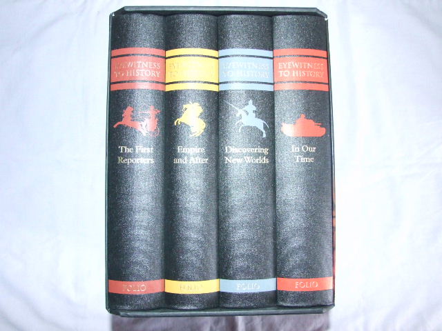 Fox, Robert - Eyewitness To History (Published in by The Folio Society in 2008. 4 Hardbacks. What was it like to be there, on the spot, at the very moment when great events took place; when great figures strode onto the world stage; when the wonderful, the terrible, the diverting and the just plain curious happened? Here, in four riveting volumes, we have the story of our world in the words of those who experienced it – from the ancient Egyptian Harkhuf as he undertakes to deliver a dancing pygmy to his pharaoh, to John Updike, over four millennia later,watching the Twin Towers collapse against the clear blue sky of a perfect New York day. Our story begins with hieroglyphics and ends with the BlackBerry. VOLUME I - THE FIRST REPORTERS; VOLUME II - DISCOVERING NEW WORLDS; VOLUME III EMPIRE AND AFTER; VOLUME IV - IN OUR TIME. 2032 pages; 24 pages of colour and black & white illustrations in each volume. )