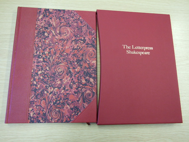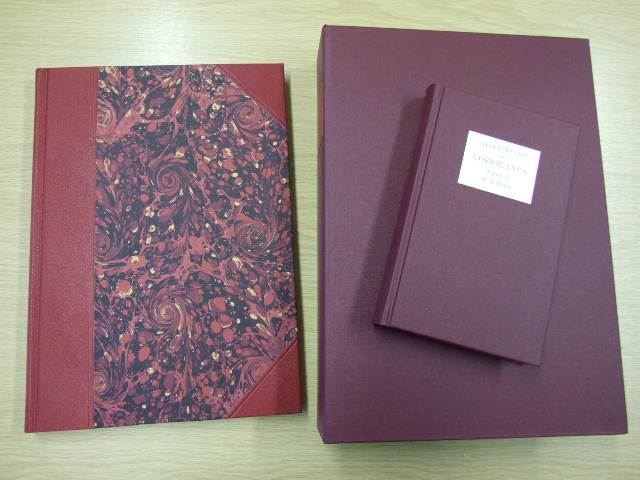 Shakespeare, William - The Letterpress Tragedy of Coriolanus Limited Edition (Published in by The Folio Society in 2008. Clamshell box. Boxed Letterpress edition. Numbered copy of 3750 numbered copies of which this is number xxx. A Letterpress edition of Shakespeare's play, created with the highest quality materials and craftsmanship. Quarter-bound in goatskin leather, blocked in gold with hand-marbled paper sides; gilded top edge and ribbon marker. Set in 16pt 'Monotype' Baskerville, printed by letterpress on mould-made paper. Presented with a commentary volume which includes the text of the play and full explanatory notes. Supplied in a buckram-bound solander box measuring 15" x 11" x 2.75". Letterpress volume: 14" x 10.75". Commentary volume: bound in buckram. 8.75" x 5.75". A pleasure to read Shakespeare's glorious language lies at the heart of his plays and here, free from the clutter of notes, every line is given the appropriate space to breathe. The text is printed by letterpress, a method now used only for the very finest private press publishing. Meticulously set on a traditional monotype machine, rather than a computer, the type letters have been individually created from hot metal in the rarely used 16-point font of 'Monotype' Baskerville. The shape of each line, and the arrangement of lines on the page, are adjusted by hand to create the most pleasing overall effect for the reader. The layout of words on a printed page is as much an art as such ancient techniques as Chinese or Arabic calligraphy. Here, the text is designed by eye and set on a manual machine, not a computer. Each letter of type has been created from hot metal in the rarely used 16-point font of 'Monotype' Baskerville, chosen for its clarity and elegance of form. Tiny irregularities testify to the hand-crafted nature of the process, since the shape of each line, the very gap between letters, is adjusted by hand to create the most pleasing overall effect. A book is a pleasure of many senses: the feel of it in the hands, even the smell of the leather and ink all contribute to the enjoyment. Running your fingers over the paper, the difference between letterpress and litho printing is instantly discernable. You can feel the indentation where each letter has been impressed into the mould-made paper. This high quality paper is made from cotton rags and wood fibres dried on a cylindrical mould which produces the feathered edge known as the 'deckle'. The quarter-binding is of finest goatskin leather, dyed to a rich colour. The pattern on the hand-marbled paper sides is unique to each volume. The craftsmen and women who work on these volumes are rightly proud of their involvement in the project. From the hand-sewing of the pages to the blocking of each label in 24-carat gold, few books have had such care lavished on them. You can be confident that these exceptional editions will give pleasure for generations to come. Unmatched in comedy and tragedy, poetry and prose, Shakespeare's plays are the crowning jewel of the English language. The creation of beautiful reading editions worthy of their stature is a dream that all lovers of his works will understand – a dream realised in The Folio Society's Letterpress Shakespeare series. Here, Shakespeare's words are given the space and setting they deserve. The meticulously designed pages and the clear and elegant type entice the eye to read, whilst the leather quarterbindings, gilded top edges and hand-marbled paper sides make these volumes a pleasure to look at and a delight to own. )