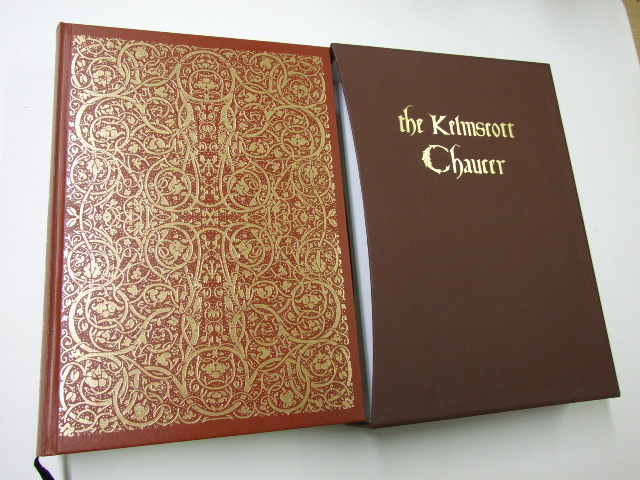 Chaucer, Geoffrey - The Works of Geoffrey Chaucer now newly imprinted Facsimile of the Kelmscott Press edition (Published in by The Folio Society in 2008. Bound in buckram, blocked with a design by William Morris. Paper specially commissioned from James Cropper, a small mill in the Lake District, England. Gilded top edge, ribbon marker. Presented in a gold blocked slipcase. 568 pages. 16.75" x 11.5". The book for which William Morris had such high hopes was The Works of Geoffrey Chaucer. Published in 1896 at Morris's Kelmscott Press, it was immediately hailed as a masterpiece of book production the finest publication to emerge from the Arts and Crafts movement and universally acclaimed as the zenith of private press publishing. The Kelmscott Chaucer, as it has become known, represents the pinnacle of Morris's career as a typographer and designer. The medieval style 'Chaucer' fount, lavish ornamental borders, decorative capitals and frames he created, combined with the stunning woodcut illustrations of Edward Burne-Jones, provide an exquisite setting for the poetic works of Geoffrey Chaucer The Canterbury Tales, Troilus and Criseyde, The Parliament of Fowls, The Book of the Duchess, The House of Fame, The Romaunt of the Rose. In fact, Morris's masterpiece is even more exquisite than the 15th and 16th- century editions he so admired. The Kelmscott Chaucer did much more than revive an antique style of bookmaking; it fulfilled Morris's vision of what could be achieved through a combination of modern printing techniques and traditional crafts. According to Morris, Chaucer was 'the most genial and humourful healthy-souled man that England had ever seen'. With the founding of the Kelmscott Press in 1890, Morris could realise the dream he had nursed since his student days of producing a volume worthy of his hero. Few publishers would have indulged in such a labour of love. The work began in 1892 and continued steadily for four years, as Morris, his co-editor F. S. Ellis and the famous pre-Raphaelite painter Burne-Jones strove for perfection in every detail, from selecting the most suitable inks and paper tousing the most authoritative Chaucerian text available, the Oxford edition of 1894. Burne-Jones's contribution to the volume cannot be overstated his 87 designs were a far cry from the stilted woodcuts of previous editions, even though he preferred not to illustrate scenes from the 'racier' episodes of The Canterbury Tales. Morris died in October 1896, but not before the publication of The Kelmscott Chaucer, considered by many to be his greatest achievement and certainly the work which was closest to Morris's heart. In this fine edition, Morris's great work has been re-presented in an exact facsimile on beautiful laid paper with gilded top edges, whilst the sturdy buckram binding is richly blocked with one of Morris's designs. With an original first edition of The Kelmscott Chaucer selling in New York for $160,000 lin 2010, this Folio Society Fine Edition facsimile represents an opportunity to own this superb facsimile at a very reasonable price. )