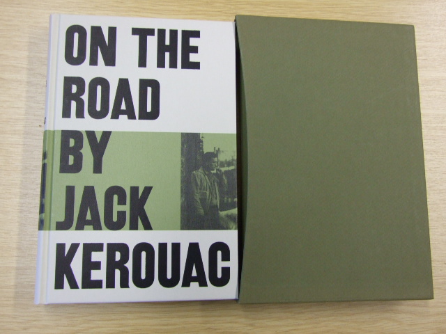 Kerouac, Jack - On the Road (Published in by The Folio Society in 2010. Bound in cloth, printed and blocked with a photograph of Jack Kerouac. Set in New Caledonia with Tooting Sans display. Approx. 288 pages; frontispiece and 12 pages of black & white plates. Book Size: 9.5" × 6.25". When Jack Kerouac's On the Road first appeared in 1957, readers instantly felt the beat of a new literary rhythm. A fictionalised account of his own journeys across America with his friend Neal Cassady, Kerouac's beatnik odyssey captured the soul of a generation and changed the landscape of American fiction for ever. With its smoky, jazz-filled atmosphere and its restless, yearning spirit of adventure, On the Road left its mark on the culture of the late 20th century, influencing countless books, films and songs. Kerouac's prose is remarkable both for its colloquial swing and for the pure lyricism inspired by the American landscape – 'the backroads, the black-tar roads that curve among the mournful rivers like Susquehanna, Monongahela, old Potomac and Monocacy'. This Folio Society edition is illustrated with evocative photographs of Kerouac and the landscapes of 1950s America. Now acknowledged as a modern classic, On the Road remains a thrilling and poignant story of the road less travelled. )