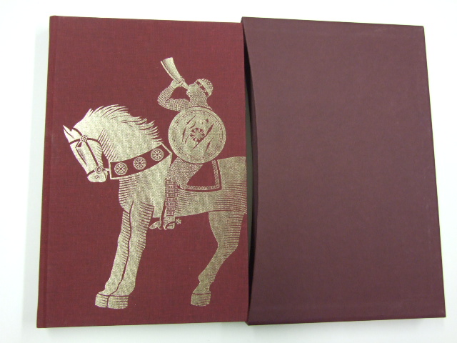 Roland - The Song of Roland (Published in by The Folio Society in 2010. The Song of Roland. Introduced by John Burnside. Illustrated by Anna and Elena Balbusso. In 778, the rearguard of Charlemagne's retreating army was ambushed in the Pyrenees and defeated. The battle of Roncevaux became the inspiration for songs and poems celebrating deeds of valour in the face of overwhelming odds. In the mid 12th century, part of this great retelling of heroic deeds was The Song of Roland. Blocked with a design by Anna and Elena Balbusso. Translated by Charles Scott Moncrieff. Bound in cloth. Set in Centaur. 176 pages. Frontispiece and 8 colour illustrations. Book size: 11" x 7.25". The Song of Roland. 'For who will lead my armies with such strength,. When he is slain, that all our days us led?. Ah! France the Douce, now art thou deserted!. Such grief I have that I would fain be dead.'. In 778, the rearguard of Charlemagne's retreating army was ambushed in the Pyrenees and defeated. The battle of Roncevaux became the inspiration for songs and poems celebrating deeds of valour in the face of overwhelming odds. In the mid 12th century, part of this great retelling of heroic deeds was The Song of Roland, the earliest surviving work of Old French and one which shows a chivalric, knightly society in full flower. It is a celebration of heroism, of feudalism and of the Franks and their love of 'France the Douce'.. Roland, most valiant of knights, is in command when the Saracens attack, directed by the traitor Ganelon. Although Roland's friend Oliver begs him to blow his olifant and recall the main part of the army, Roland refuses. A small force of Franks makes a last stand against 400,000 Saracens, and, one by one, the brave warriors fight to the death. At last, Roland blows the horn and Charlemagne gallops to the rescue – but the king is too late to save his valiant paladins, and can only avenge their deaths.. Charles Scott Moncrieff fought during the First World War, and translated the Song of Roland during the summer of 1918, when 'the sound of the olifant came so often and so direfully across the Channel'. His courtly and romantic translation, written in the original measure, is dedicated to his three best friends, including the poet Wilfred Owen, who died in the war. With its focus on honour and the feudal obligations between lord and vassal, the poem is a rich evocation of a vanished age. Yet its depiction of its soldiers, their trust in one another, their capacity for heroism and their grief for their fallen comrades, resounds through the centuries. This Folio Society edition contains exquisite illustrations by sisters Anna and Elena Balbusso. Poet John Burnside contributes a sensitive introduction exploring the chivalric code of the poem and the paradoxical nature of Roland's sacrifice.. 'In their emotional range, in their recognition of terror and, most of all, in their profound grief for their doomed companions, these men are much more heroic, and much more true to life, than their fictional counterparts of more recent times'. JOHN BURNSIDE. )