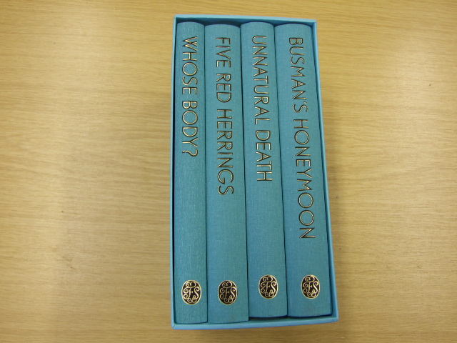 Sayers, Dorothy L - The Dorothy L Sayers Mysteries Collection comprising Busman's Honeymoon, Five Red Herrings, Unnatural Death and Whose Body? (Published in by The Folio Society in 2011. Four volumes. Bound in cloth. Blocked with individual designs by Natacha Ledwidge. 1,208 pages in total. 28 full-page black & white illustrations and numerous tail pieces. Book Size: 9" x 5.75". Introduced by P D James. The 1920s and 30s were a golden age for detective fiction. Many popular writers from the era have passed into obscurity, but one in particular is still loved and praised by writers, critics and aficionados of the genre: Dorothy L. Sayers. She wrote ingenious whodunits that were also satisfying and intelligent novels. Her prose is elegant and expressive; her settings, whether a Scottish fishing community or the clubs and drawing-rooms of Mayfair, are vividly realised, and her characters are flesh-and-blood human beings – most memorably her hero, Lord Peter Wimsey. Debonair and fabulously rich, yet suffering from shell shock from his time in the First World War and tortured by his conscience, Wimsey is one of the most charismatic fictional detectives ever created. 'A respectable Battersea architect has discovered a dead man in his bath.' 'Indeed, my lord? That's very gratifying.' )