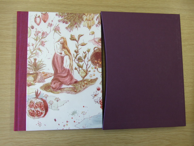 Rossetti, Christina - Goblin Market and Selected Poems (Published in by The Folio Society in 2011. Three-quarter-bound in cloth with a Modigliani paper side. Printed with a design by Jillian Tamaki. Gilded top edge. Set in Perpetua. 176 pages. Frontispiece. 10 colour and 5 black & white illustrations. Book size: 10.25" × 7.5". An extended poem about two young sisters who hear goblin merchants hawking their wares. Lizzie urges caution but Laura eats the forbidden fruit and falls into a frenzy, from which her sister must save her. Christina Rossetti is one of the most frequently anthologised of 19th-century poets, her poems read at services and sung as hymns and carols. She is sometimes thought of as a fragile, pious invalid, an 'angel in the house' whose poems dwell on heaven and death, but further reading reveals a vital and exuberant poetic gift that influenced writers like Emily Dickinson and Virginia Woolf. This Folio Society edition brings together a selection of her finest verse. )