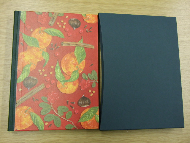 David, Elizabeth - Elizabeth David's Christmas (Published in by The Folio Society in 2012. Edited by Jill Norman. Foreword by Lisa Chaney. Illustrated by Sophie MacCarthy. Quarter-bound in buckram with Modigliani paper sides. Printed with a design by Sophie MacCarthy. Set in Bembo. 224 pages. Frontispiece. 6 colour illustrations. Book size: 9" x 5.75". 'On at least one day during the Great Too Long Stretch I stay in bed, making myself lunch on a tray. Smoked salmon, home-made bread, butter, lovely cold white Alsace wine. A glorious way to celebrate Christmas.' In her introduction to this anthology of Christmas food, Elizabeth David rebels against the 'obsessive present-buying and frenzied cooking' that characterise modern celebrations. Instead, she advocates a simpler and in every sense more tasteful approach, with delicious, straightforward recipes that liberate the weary chef from some of his or her festive toil. Readers familiar with Elizabeth David's continental recipes will be pleasantly surprised to find a wealth of traditional British specialties here, such as dry-spiced beef and roast pheasant with chestnut sauce, as well as Christmas dishes from further afield. Never a slave to convention, she suggests, for a small group, 'something simple and unexpected such as a big bowl of crimson sweet-sour cherry sauce with a roast duck; a handsome dish of tomatoes stuffed with savoury rice with a capon; a Madeira and truffle-scented sauce with a piece of plain roast beef; sliced oranges with a pork roast or a ham.' While candidly admitting that she finds Christmas pudding 'a pretty awful concoction', she nonetheless supplies two excellent recipes. There are wonderful literary and historical vignettes and personal anecdotes, from childhood Christmases spent with her cousins in Hampshire to a wartime Christmas in her tiny flat in Cairo with her cook Suleiman proudly bringing in the blazing Christmas pudding – before the turkey. Sophie MacCarthy has illustrated all of the Folio Society editions of Elizabeth David's books. Her artwork for this book is particularly delectable in its colour and simplicity. In a new foreword, biographer Lisa Chaney describes the genesis of Elizabeth David's food writing career and praises a 'culinary manual of good food for family and friends at Christmas.' )