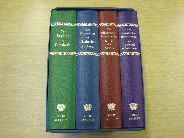 Rowse, A L - The Elizabethan Age in Four Volumes (Published in by The Folio Society in 2012. Bound in buckram. Blocked with individual designs by Neil Gower. Set in Centaur with Caslon Antique Display. Frontispiece and 24 pages of colour plates in each volume. 2104 pages in total. Book size: 9.5" × 6.25". The reign of Elizabeth I (1558–1603) has been described as England's golden age. It was a time when the country was peaceful, yet dynamic: expanding its borders, voyaging to the Indies and the New World, and creating an extraordinary cultural legacy. Published between 1950 and 1972, A. L. Rowse's history remains an unrivalled portrait of Elizabeth and her era. Rowse was a brilliant historian who laid an unprecedented emphasis on social history and the use of local archives. Above all, he had a talent for bringing the past to life. For him, Elizabethan England could still be seen everywhere, from country church to great house. 'The age is indeed all about us, as Elgar said of music: it is in the air all round, we have only to reach out and catch it.' The Folio Society presents his classic work in four beautifully illustrated volumes. )