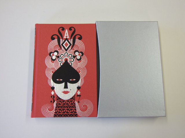 Pushkin, A S - The Queen of Spades and Other Stories (Published in by The Folio Society in 2014. Bound in cloth, blocked with a design by Anna & Elena Balbusso. Translated by Alan Myers. Set in Bembo. 320 pages; frontispiece and 6 colour illustrations. Printed endpapers. 9.5" x 6.25". When conceiving his master-piece Anna Karenina, Leo Tolstoy took inspiration from a discarded story of Alexander Pushkin's: 'It came upon me in spite of myself, thanks to the divine Pushkin.' This authoritative collection contains Pushkin's most celebrated and influential prose. Nowhere is Puskin's famous economy of expression starker than in the eponymous story, his only piece of prose fiction to garner immediate contemporary acclaim. It is an audacious, beguiling tale of greed and obsession. As introducer Rachel Polonsky writes, 'With its diamond-hard, flawlessly clear surface and its unfathomable suggestive depth, "The Queen of Spades" is literature's supreme tease.' The story of ill-fortuned Hermann and his dalliance with the high-society gambling tables of St Petersburg draws the reader into an enthralling and unwinnable game. Questions of chance, fate and supernatural forces are maddeningly unanswered as Hermann foolishly pursues the elderly Countess and her secrets. )