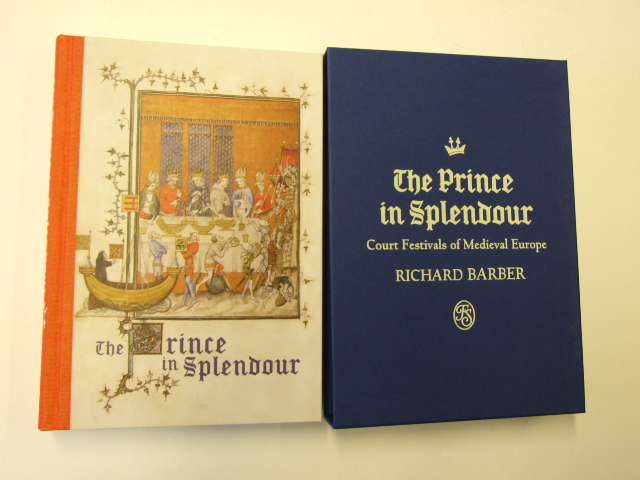 Barber, Richard - The Prince in Splendour: Court Festivals of Medieval Europe (Published in by The Folio Society in 2017. Three quarter-bound in cloth with a Modiglaini paper front board. Set in Poliphilus and Blado display. 280 pages. Frontispiece and 24 pages of colour plates. Blocked slipcase. 9" x 6.25". Introduced by the author. In this fascinating study, historian Richard Barber examines the elaborate pomp and ceremony of the medieval court festival, revealing as he does so its wider cultural and political importance. This volume is published exclusively by The Folio Society. Festivals were many and varied, but they always functioned as part of religious, dynastic or political agendas: from coronations and knightings to celebrations of the birth of royal children, betrothals, weddings, visits from foreign princes, and rulers challenging each other to tournaments. Barber expertly examines, in unprecedented detail, the many different facets of the festival: the food and fashions, the art and music, the organisation, financing and logistics of such grandiose events, and the people that made the splendours possible. René, Duke of Anjou, for example, entered a joust with a procession that included two Turkish attendants 'leading live lions on silver chains'. Food was often served in a similarly dramatic style: entire courses gilded with gold leaf, or guests presented with elaborate castles made of pastry. Minstrels and troubadours would compete for their lords' attentions, while dancing was so enthusiastic that one gathering collapsed a ceiling. New technologies, such as automata and clockwork, made events more memorable; roaring lions in the Byzantine court, boats in pools of water cunningly moved by a concealed mechanism, and even fire-breathing beasts. )