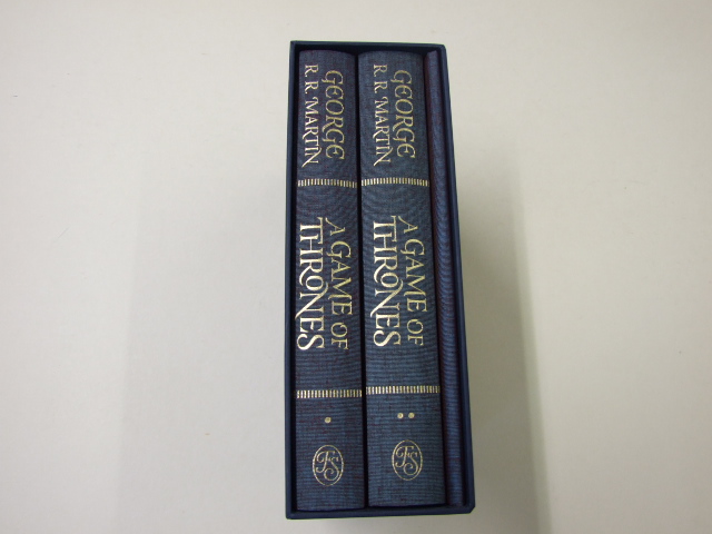 Martin, George R R - A Storm of Swords (Published in by The Folio Society in 2020. A Game of Thrones is presented in a spectacular collector's edition in the Folio Society series of George R. R. Martin's 'A Song of Ice and Fire'. A publishing phenomenon; the biggest TV series in the world; a book that revolutionised a genre. A Game of Thrones is also, above and beyond all these things, a uniquely addictive piece of literature, claiming legions of fans and winning vast critical acclaim, and now The Folio Society presents the ultimate illustrated collector's edition. Bound in three-quarter blocked cloth with a printed and blocked cloth front board. Set in Vendetta with Esmeralda as display. 1,128 pages in total over two volumes. 12 full page illustrations and 4 double-page spread colour illustrations. Printed in black & gold throughout. 11 illustrated chapter openers and 15 illustrated house sigils. 15 family trees in volume two. Printed endpapers. Coloured tops. The bloodiest, boldest and most addictive saga in fantasy continues with A Storm of Swords, the third volume in the ground-breaking 'A Song of Ice and Fire' series. Taking the world by storm, George R. R. Martin's fantasy epic has won millions of fans worldwide, and these Folio editions – described by the author as 'masterpieces of the bookmaker' art' – are packed full of details that devoted readers will find irresistible. Featuring exquisite illustrations by series artist Jonathan Burton, updated genealogies, a pair of bindings blocked in red and gold foils and specially designed chapter headings, this edition of A Storm of Swords exemplifies everything that makes a Folio edition so coveted. )