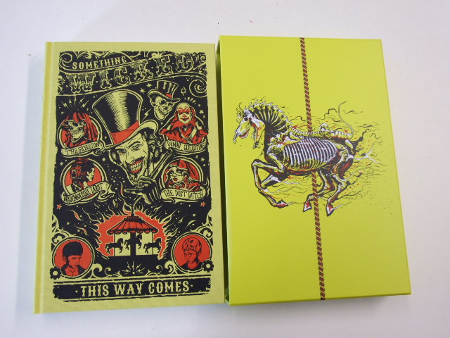 Bradbury, Ray - Something Wicked This Way Comes (Published in by The Folio Society in 2020. Bound in blocked cloth. Typeset in Columbus. 272 pages. Frontispiece and 6 colour illustrations, including a double-page spread. Blocked slipcase. 9.5" x 6.25". Comedian, writer and broadcaster Frank Skinner introduces the new Folio edition of Ray Bradbury's dark fantasy masterpiece Something Wicked This Way Comes, with thrilling illustrations by artist Tim McDonagh. Described by Bradbury himself as the book he loved 'best of all the things I have written', Something Wicked This Way Comes is a timeless classic of fantasy horror. For this lavishly illustrated collector's edition, Tim McDonagh has provided seven colour illustrations dripping with carnivalesque menace. The eerie inhabitants of Cooger & Dark's Pandemonium Shadow Show are lit with the gaudy yellow and red lights of the funfair, while Mr Dark leers from the midst of his attractions, the faces of his victims tattooed across his palms. Like Bradbury's prose, the images in this special Folio edition invite the reader to venture a little deeper into that dark tent, promising wonders and horrors and everything in between. Comedian and actor Frank Skinner lists the book as amongst his favourites, and in his incisive and affectionate introduction written for this edition he examines the many delicious flavours of fear in a novel layered with meaning and portents. )