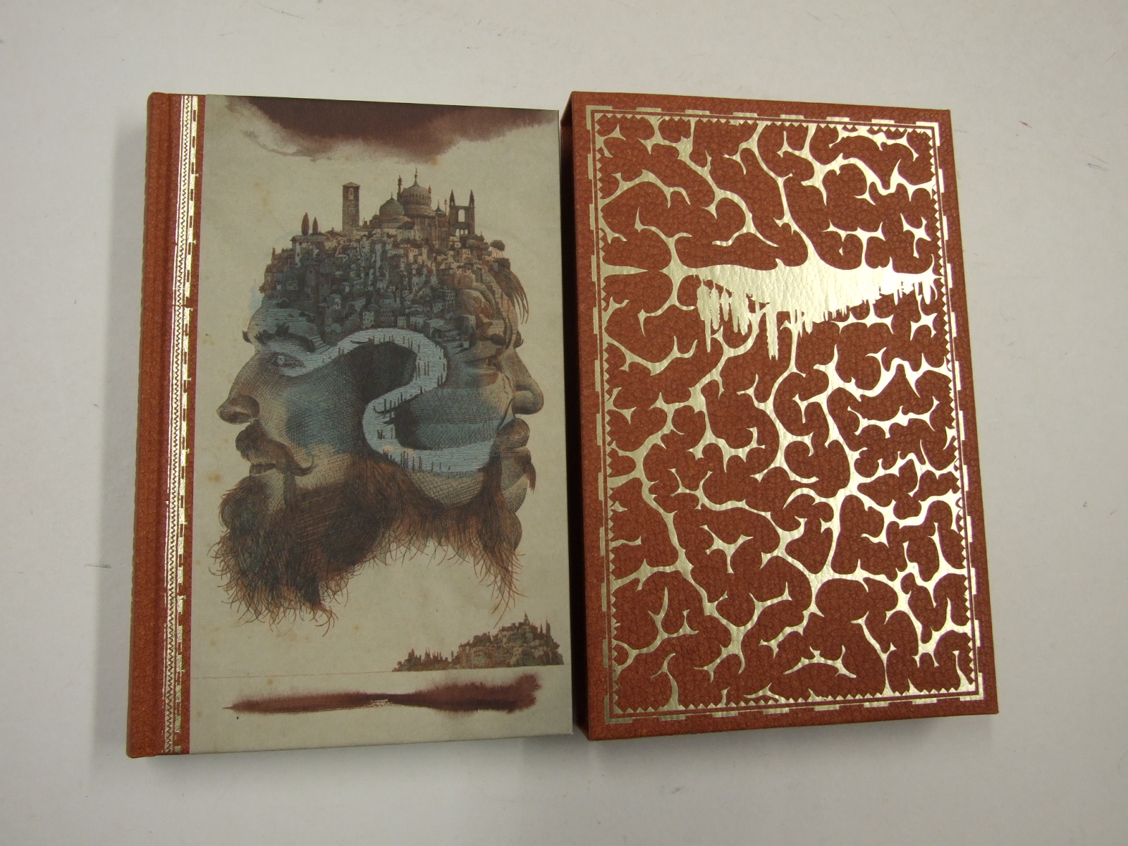 Calvino, Italo - Invisible Cities (Published in by The Folio Society in 2023. Illustrated by Dave McKean. Introduced by Jeanette Winterson. Translated by William Weaver. Italo Calvino's beguiling and mysterious Invisible Cities defies explanation. Dave McKean's rich visuals illustrate the wondrous and impossible urban landscapes in a Folio edition that is introduced by Jeanette Winterson. In Invisible Cities, Calvino mirrors reality in fantastical prose through imagined conversations between the explorer Marco Polo and Mongol Emperor Kublai Khan. He conjures imaginary places gradually revealed to be the different quarters of ancient and modern Venice. Dave McKean was an immediate choice to capture the rich visuals of Calvino's landscapes and abstract concepts in ten intricate colour illustrations, plus 27 integrated illustrations. Stunning cover visuals evoke labyrinthine fantastical cities unspooling from the minds of the narrators. Gorgeous, printed marbled endpapers give the feel of a prized find in an ancient market. This unique and wonderful oddity weaves together prose, poetry and philosophy, provoking questions about the complex nature of writing's limitations alongside the impossible and beguiling spaces the novel's characters inhabit. Jeanette Winterson's insightful introduction encourages the reader to explore those questions further, giving us a valuable glimpse into Calvino's world, writing process and evolution. Calvino's words were just waiting for their perfect match and found them in this stunning Folio edition. Quarter-bound in textured paper with paper case sides. Gold and blind blocking on spine. Gold rules on quarter binding. Set in LTC Italian Old Style. 184 pages with 10 full-page colour illustrations and 27 integrated illustrations. Printed 4-colour throughout. Printed endpapers. Slipcase covered in textured paper blocked with gold foil. 8" x 5.25". )
