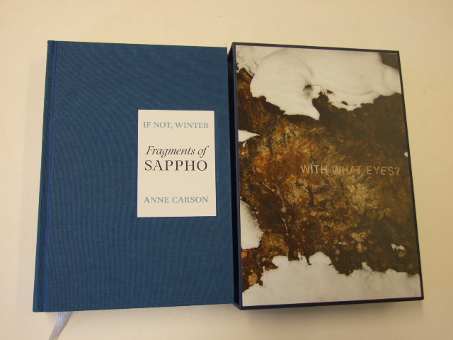 Sappho Translated by Anne Carson - If Not, Winter Fragments of Sappho (Published in by The Folio Society in 2019. Sappho's complete surviving oeuvre is translated faithfully for the first time, by poet and renowned scholar Anne Carson, in this exquisite new Folio Society letterpress edition. Anne Carson's beautiful, brave and unadorned translation of Sappho's complete surviving work is printed letterpress throughout to evoke the original papyrus fragments onto which the words were transcribed. In a careful consideration of the text, this large-format edition presents the English translation of each fragment facing the original ancient Greek, each page individually typeset so the spacing and breaks are precisely replicated. Bound in blocked cloth with inset letterpress printed label. Set in Aria Text and letterpress printed. 416 pages. Colour frontispiece. Pictorial slipcase. Gilded page tops.