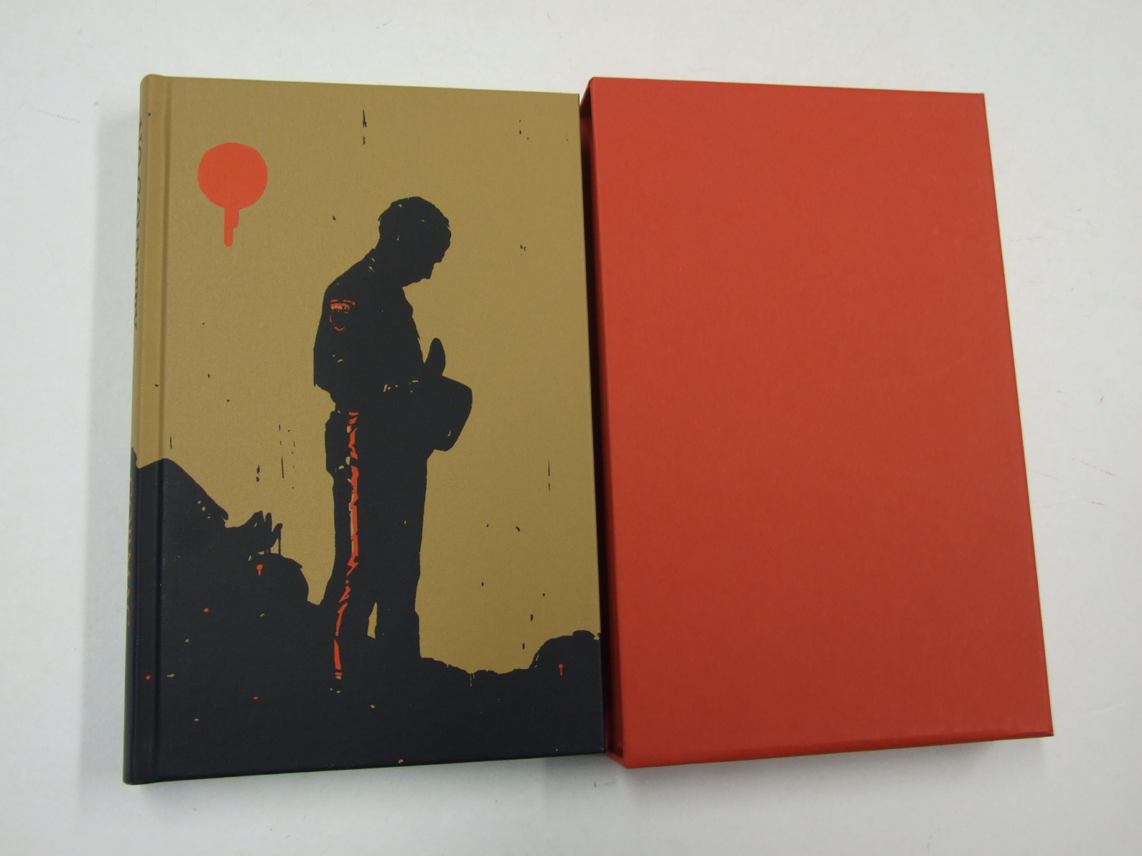 McCarthy, Cormac - No Country for Old Men (Published in by The Folio Society in 2023. Illustrated by Gérard DuBois. Cormac McCarthy's sparse and beautiful writing is perfectly mirrored by Gérard DuBois's hauntingly understated images for this Folio Society edition of the Western thriller No Country for Old Men. With his pale blue eyes and dead stare, McCarthy's villain Chigurh remains one of modern fiction's most memorable bad guys. Set in West Texas, No Country for Old Men unfurls from the bloody aftermath of a clash of cartels, a deal gone wrong, and a very, very bad decision. Audiences remain captivated throughout by the stone-cold killer at the heart of McCarthy's cinematic Western. Gérard DuBois, whose illustrations for Folio's The Road won him the Moira Gemmill Illustrator of the Year Prize at the V&As, returns with his signature style that so perfectly complements McCarthy's writing. His masterfully chosen colour palette paints scenes in black-and-white or faded desert hues, shot through with splashes of blood red. Through seven quietly arresting images, DuBois nods to traditional Western artists while capturing a stillness, often in the aftermath of violence or the tension of waiting. Bound in cloth screen-printed with a design by the artist, the cover art is muted yet beautifully rendered in dusky ochre. When you look closely, you glimpse the startling body count reached by the end of McCarthy's modern Western masterpiece of American literature. Bound in screen-printed cloth. Set in Maxime. 224 pages. Black & white illustrated title-page spread plus 6 colour illustrations. Plain slipcase. 9" x 5.75". )