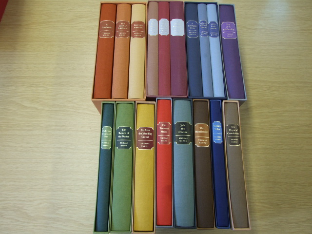 Hardy, Thomas - Complete Thomas Hardy set of 18 Novels (Published in by The Folio Society in 1990. 18 Fine or Near Fine Hardbacks in Near Fine or better slipcases. 9 volumes in individual slipcases, all reprints. Tess of the d'Urbervilles (1991); Under the Greenwood Tree (1991); The Return of the Native (1992); Far from the Madding Crowd (1992); The Mayor of Casterbridge (1991); The Trumpet Major (1991), Jude The Obscure (1992, First Thus), The Woodlanders (1992), The Wessex Tales (1991). First set of 3 Fine in Fine slipcase, 1993 First Thus. Desperate Remedies, A Laodicean, The Hand of Ethelberta. Second set of 3 Near Fine (very slight rubbing to title panels) in Fine slipcase 1992 First Thus. A Pair Of Blue Eyes; Two On A Tower ; The Well-beloved. Third set of 3 Fine in Fine slipcase 1994 First Thus: A Changed Man; Life's Little Ironies; A Group of Noble Dames. )