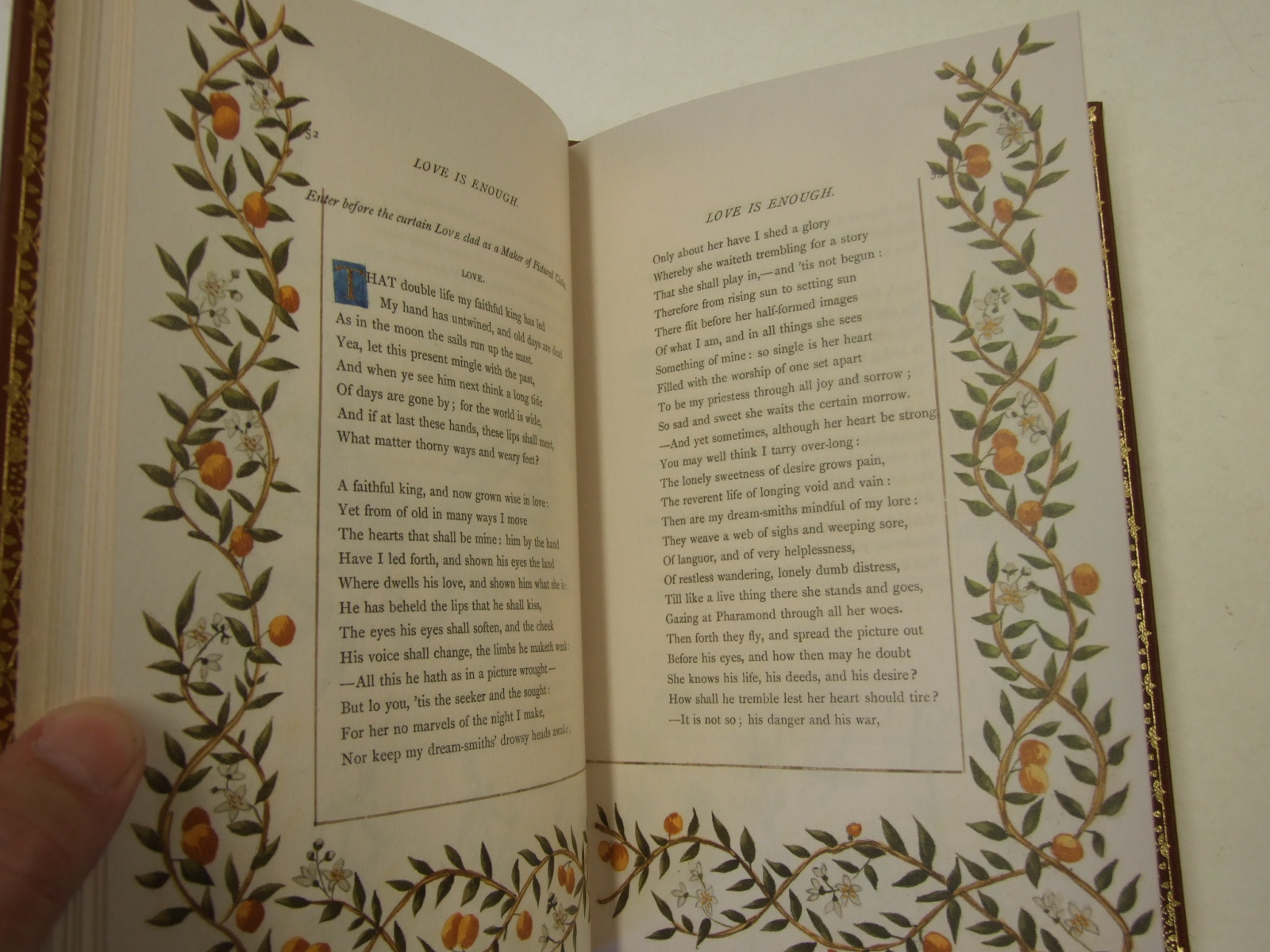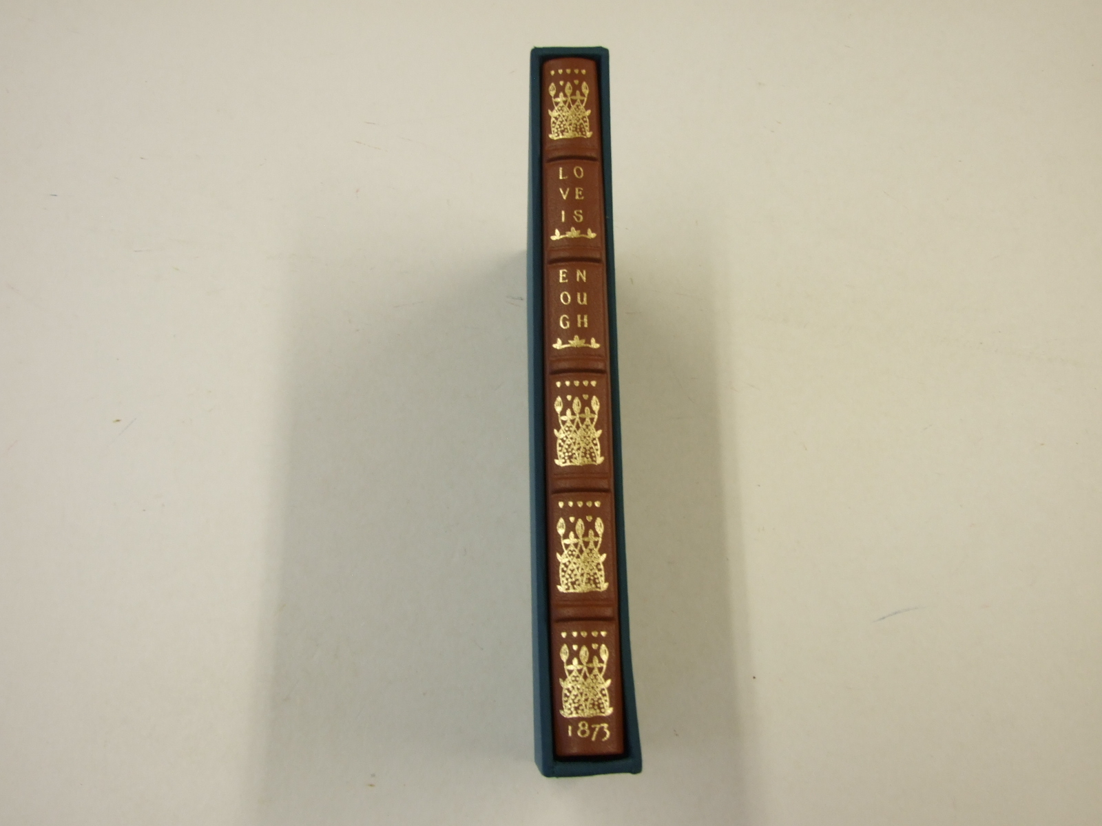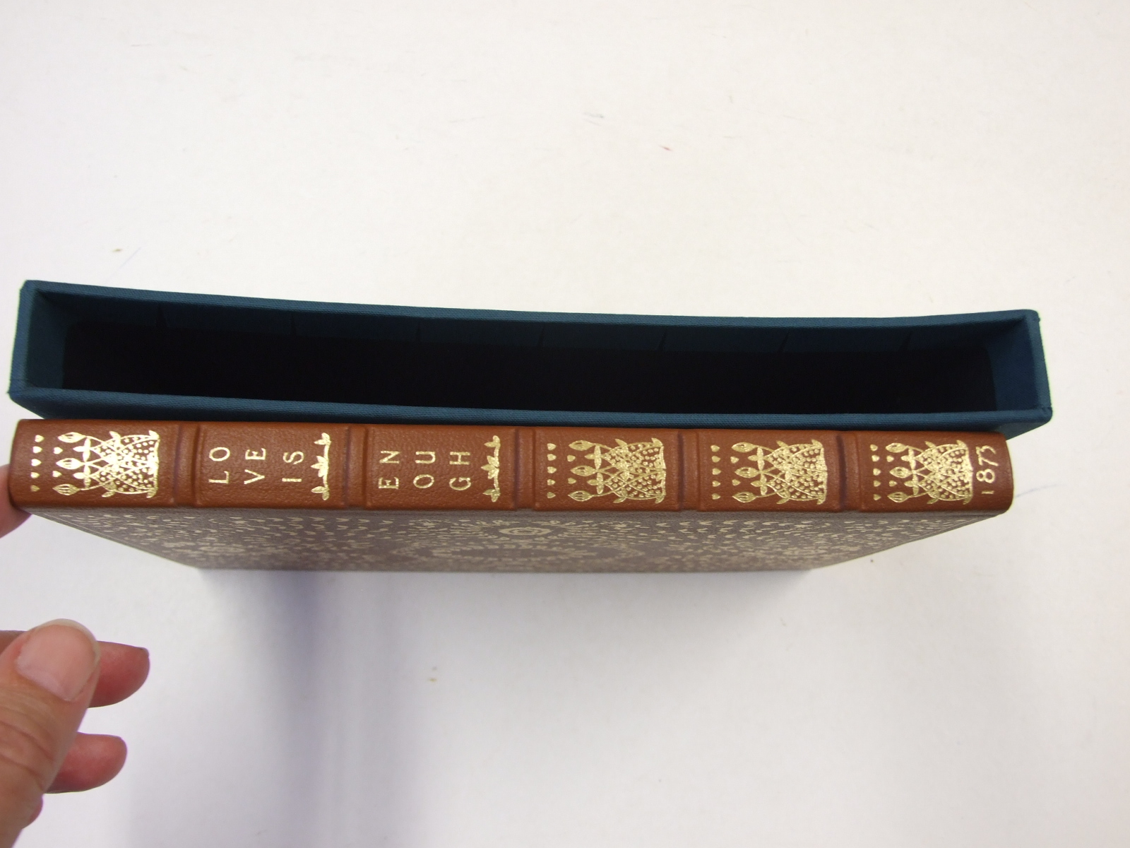 Published in United Kingdom by Folio Society. 2018. First Printing. Fine Hardback. No inscriptions or bookplates. Near Fine slipcase. Slight marks to panels of slipcase. Meticulously produced facsimile of William Morris's poetic masterpiece. Illustrated on every page and fully bound in leather blocked in gold. Illustrated by Beatrice Pagden. Housed in The Morgan Library & Museum in New York is a rarely seen jewel of Arts and Crafts book production – a personalised copy of William Morris's poetic masterpiece Love is Enough, hand-illustrated on every page with vibrant floral watercolours by Beatrice Pagden and strikingly bound by the legendary Thomas James Cobden-Sanderson for its original owner, Morris's publisher and confidant, Frederick Startridge Ellis. Limited to 750 hand-numbered copies of which this is number 376. Hand-bound in leather blocked in gold on front, back, spine and doublures. 152 pages. Abundant floral illustrations by Beatrice Pagden. Slipcase covered in teal cloth blocked in gold. 9" x 5.75". Love is Enough is now recognised as Morris's most self-revealing work. He started writing it at the end of 1871, immediately after his return from a cathartic expedition to Iceland, undertaken to escape life in a strained ménage à trois with his wife, Jane, and her lover, the pre-Raphaelite painter-poet Dante Gabriel Rossetti. Seen in this light, the emotional turmoil of Pharamond, his gruelling journey in search of peace and fulfilment, his encounter with a usurper and his faith in the all-conquering power of love take on an intensely personal meaning.