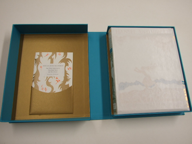 12?× 9¾?. Commentary volume: 16 pages set in Caslon type. Printed on Abbey Wove paper. Thread sewn with a cover of Natural Evolution Ivory paper. Cover printed in gold and orange inks to match the endpapers. Printed title label on front. 8¾?× 5??. Presentation box: Bound in cloth specially made to match the turquoise on the binding. Blocked in gold on front and spine with images redrawn from a copy of the first edition. 12¾?× 10?