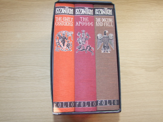 Norwich, John Julius - Byzantium: The Early Centuries, The Apogee and The Decline and Fall (3 volumes) (Published in by The Folio Society in 2003. This sweeping history spans more than 11 centuries including the ideas and the people who are at the heart of the story of Byzantium. 412pgs, 450pgs, 537pgs. Bound in Serana cloth blocked with individual designs by Neil Packer. 1,480 pp in total with 25 pp of colour illus. in each volume. Map endpapers. When Constantine the Great finally gained sole control of the ailing Roman Empire in AD 323, he had no doubts about where to build a new capital: the ancient Greek city of Byzantium. The story of its spectacular rise and fall is one of the most compelling in the history of civilisation. )