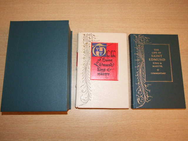 Lydgate, John, A S G Edwards, St Edmund - The Life of Saint Edmund, King and Martyr Limited Edition (Published in by The Folio Society in 2004. Boxed Set Facsimile Copy Plus Separate Volume of commentary. Large 4to. Limited edition of 1010 copies of which this is letter 'Q'. This facsimile has been reproduced from the manuscript MS Harley 2278 in the British Library through digital photography by Laurence Pordes and printed by Cambridge University Press on Furioso paper from the Biberist mill in Switzerland supplied by John Purcell Paper. Bound by Smith, Settle in full Nigerian goatskin with leather onlays, blocked with a design by David Eccles, with handmade laid-paper endleaves from the Fabriano Mill, Italy. All edges gilt, leading edge has the tiniest scratch, silk bookmark. The companion volume is by John Lydgate with introduction, transcript and commentary by A.S.G. Edwards. Bound in buckram with gilt lettering and decorations on cover and spine. Original publisher's green box with gilt framed red leather tablet and black title to spine edge. )