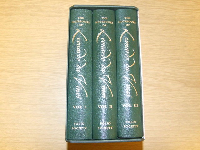 da Vinci, Leonardo - The Notebooks of Leonardo da Vinci (Published in by The Folio Society in 2009. A major new edition in three beautiful illustrated volumes. The genius of Leonardo da Vinci (1452-1519) has never been rivalled. In the Mona Lisa and The Last Supper, he created the most iconic images in Western art, and to many he is simply the greatest painter who ever lived. Yet his brilliance extended well beyond these masterpieces. As well as his paintings, Leonardo left behind the most extraordinarily diverse body of written work ever created by one individual. Written in his unique mirror-writing, Leonardo's notebooks reveal his astonishingly prescient discoveries in anatomy, medicine, engineering, optics, architecture, hydraulics, botany and natural history. The illegitimate son of a notary and a peasant woman from the small town of Vinci, Leonardo had no formal education aside from his apprenticeship as a painter, which began at age 14. He knew no Latin, a huge disadvantage at the time. This very lack of education caused him to rely on his own observations and experience, rather than written authority a revolutionary new method, far ahead of its time. Training his all-seeing gaze on the world around him, Leonardo made deductions that are uncanny in their accuracy. 'The sun does not move,' he noted, 100 years before Galileo reached the same conclusion. He also found that 'Every weight tends to fall towards the centre by the shortest way', 150 years before Isaac Newton. In carrying out his experiments in anatomy, Leonardo realised that blood circulated around the body – a breakthrough in medicine that was later confirmed by William Harvey in 1628. And when he wrote of the 'quality of time as distinct from its mathematical divisions', he was setting out on a path that was later travelled by Einstein. Quarter-bound in leather with printed cloth sides. Specially commissioned introduction by Charles Nicholl, biographer of Leonardo.Set in Bembo, 1,432 pages with 98 pages of colour plates. 9.5 x 6.25 ins. )