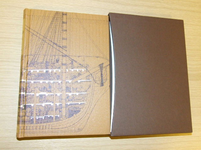 Rodger, N A M - The Wooden World An Anatomy of the Georgian Navy (Published in by The Folio Society in 2009. 22pp. 2009. Numerous colour photographic reproductions. First published in 1986 this Folio Society edition follows the text of the 1998 Fontana Press paperback edition with corrections. Brutal captains, dishonest pursers and an inefficient Board doling out inedible rations to a drunken crew … this was once the traditional image of the 18th-century British Navy. Yet how could this regime have given rise to the greatest sea power in the world, glorious victor in a succession of conflicts including Quiberon Bay and the Battle of Havana? In this ground-breaking social history, Nicholas Rodger explodes the Victorian myth of the Georgian Navy as a 'floating hell'. Focusing mainly on the period of the Seven Years' War, he draws on ships' musters and pursers' accounts to reveal a highly organised fighting force that was also a society in miniature. Rodger shows that surprisingly few men deserted, that volunteers far exceeded impressed men, that captains were loath to flog and that the Navy Board responded promptly to complaints. For penniless recruits, the Navy offered a decent wage, a uniform and even a pension. It was also to a large extent a meritocracy, providing the opportunity for competent sailors to rise to become petty officers, with a few even reaching high command. Placing naval history within its wider context, Rodger shows how the Navy was a world apart, with its own traditions, dress and language, but also how these customs mirrored British society in general. His lively account introduces us to the everyday reality of life at sea, from a typical list of livestock on board (a goat, half a dozen sheep, four hogs and thirteen ducks) to the crew who complained that they had to 'creep on our hands and knees to our hammocks' since the ship was so small. For anyone interested in the navy of Nelson or the fiction of Patrick O'Brian, this is an absorbing and entertaining ship's-eye view. New foreword by the author. Bound in cloth, printed and blocked with a design by Mark Myers, based on 'Section Through a First-Rate, 1701'. Set in Minion Pro. 448 pages; frontispiece and 24 pages of colour and black & white plates. Size: 10x7 ins. )