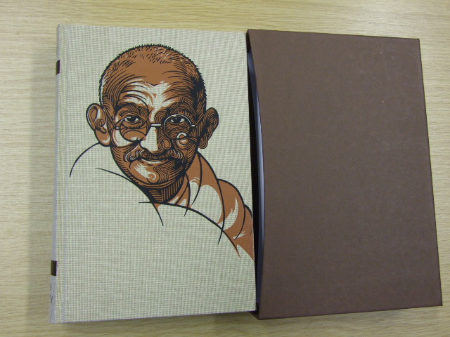 Gandhi, M K - Gandhi: An Autobiography (Published in by The Folio Society in 2010. Introduced by William Radice. New glossary compiled by William Radice. Bound in cloth. Set in Erhardt. 472 pages. Frontispiece. 24 pages of black & white plates. Book size: 9.25" × 6.25". Born in 1869, Mohandas K. Gandhi – also known as 'Mahatma', or 'great soul' – became one of the most prominent and inspiring figures of the 20th century. In his acclaimed account of the first half of his life, Gandhi recounts his childhood in India, education in England and early legal career in South Africa, before his return home to take up the cause of Indian self-determination. It is also the story of how he developed his principle of 'satyagraha' – the steadfast, non-violent resistance to injustice that propelled the Indian struggle for independence and countless subsequent protests. Gandhi is endearingly candid in his descriptions of his marriage at 13 and his early struggles with 'carnal desire', as well as his experiments with meat-eating, carried out in secret as he knew that his parents would be horrified. While working in South Africa as a junior barrister, Gandhi fought for justice on behalf of indentured Indian labourers there. He experienced racism and assault and was initially banned from joining the Bar Council, but met these obstacles with the practical fortitude that became his trademark: when a white barber refused to cut his hair, he bought a pair of clippers and did it himself. All of his 'experiments', whether celibacy, fasting or cleaning toilets at a political conference, had one end: truth and justice. Returning to British-ruled India in 1915, Gandhi began to mobilise his fellow Indians in peaceful demonstrations against injustices; not just the 1919 massacre at Amritsar, but the martial law that followed, during which innocent men and women were imprisoned and persecuted. The measures he advocated, such as Hindu–Muslim unity and the abolition of untouchability, put him in mortal danger and displeased his friends and colleagues. But, as he so eloquently puts it, 'truth is hard as adamant and tender as a blossom'. Rare photographs of Gandhi's early life are included, and a new introduction by poet and scholar William Radice explores Gandhi's unique combination of humility, charisma and strength of will. )