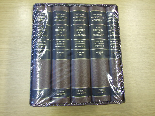 Macaulay, Thomas Babington - The History of England from the Accession of James II Introduction by Peter Rowland in 5 Volumes (Published in by The Folio Society in 2009. Five volumes. Bound in a classic buckram binding, relief-blocked with coins from the late 17th and early 18th centuries. Set in Baskerville. 2,696 pages with 72 pages of colour and black & white illustrations. Newly commissioned introduction from Richard J. Evans, Regius Professor of Modern History, University of Cambridge. Book Size: 10 x 6.25 ins. One of the greatest and most influential works of history. In the first half of the 19th century, Europe was convulsed by revolution: in France, Spain, Germany, Hungary and Italy, kings were deposed, governments rose and fell, blood was spilt. Britain, it seemed, was uniquely fortunate in having avoided such tumult. It took the brilliant politician and man of letters Thomas Babington Macaulay to ask: How was it that Britain remained peaceful, while, as he put it, 'the proudest capitals of Western Europe have streamed with civil blood'? For Macaulay, the answer was to be found more than 150 years before, in the short period of British history following the 'Glorious Revolution' of 1688, when the British Parliament ousted one king and chose another, without the country descending into civil war. Macaulay made his case in one of the most successful and brilliant histories ever written. Macaulay was one of the first writers to draw on contemporary news-sheets, tracts and ballads as source material for his history. He greatly admired the novels of Sir Walter Scott, and believed that historians should learn from the dramatic techniques of novelists. This outlook gave him the ability to enter into the spirit of the times and convey what it was actually like to live through them – a revolutionary approach which would captivate readers, while his shrewd grasp of politics gave added power to his account. For its scope, its drama and its conviction, Macaulay's history remains as exhilarating to read as it was when it was first published. )