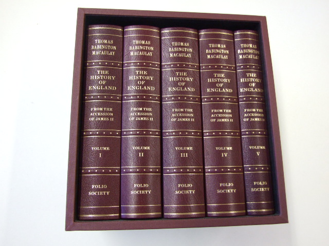 Macaulay, Thomas Babington - The History of England Limited Edition (Published in by The Folio Society in 2009. Bound in full goatskin leather, blocked in gold with traditional raised bands and top edge gilding Strictly limited to 500 copies of which this is number 23. Newly commissioned introduction from Richard J. Evans, Regius Professor of Modern History, University of Cambridge. 5 volumes. Set in Baskerville. 2,696 pages with 72 pages of colour and black & white illustrations. Book size: 10" x 6.25". In an age distinguished for its great histories, this majestic 5-volume History of England stands proud as the finest work of 19th-century scholarship, as compelling and absorbing today as when it was first published. To do justice to the book's exceptional stature, we have produced a superb edition, which will grace any book collection. Bound using the finest goatskin leather, tooled with gold on traditional raised bands and with top-edge gilding, this special edition is strictly limited to just 500 numbered copies. In the first half of the 19th century, Europe was convulsed by revolution: in France, Spain, Germany, Hungary and Italy, kings were deposed, governments rose and fell, blood was spilt. Britain, it seemed, was uniquely fortunate in having avoided such tumult. It took the brilliant politician and man of letters Thomas Babington Macaulay to ask: How was it that Britain remained peaceful, while, as he put it, 'the proudest capitals of Western Europe have streamed with civil blood'? For Macaulay, the answer was to be found more than 150 years before, in the short period of British history following the 'Glorious Revolution' of 1688, when the British Parliament ousted one king and chose another, without the country descending into civil war. Macaulay made his case in one of the most successful and brilliant histories ever written. Macaulay was one of the first writers to draw on contemporary news-sheets, tracts and ballads as source material for his history. He greatly admired the novels of Sir Walter Scott, and believed that historians should learn from the dramatic techniques of novelists. This outlook gave him the ability to enter into the spirit of the times and convey what it was actually like to live through them – a revolutionary approach which would captivate readers, while his shrewd grasp of politics gave added power to his account. For its scope, its drama and its conviction, Macaulay's history remains as exhilarating to read as it was when it was first published. )
