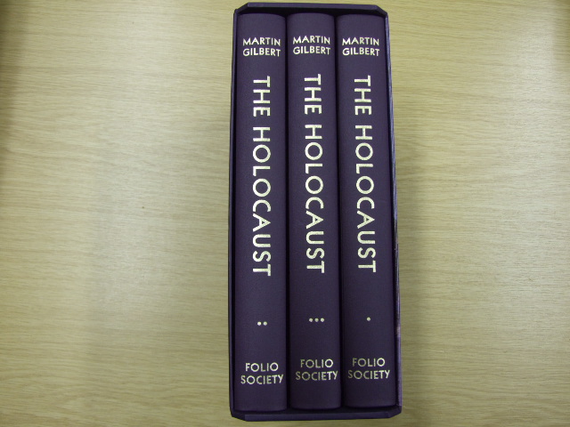 Gilbert, Martin - The Holocaust (Published in by The Folio Society in 2012. Three volumes. Bound in cloth. Blocked with a design based on the memorial Track 17 at Grunewald station, Berlin. Set in Erhardt. 952 pages in total. 75 pages of colour and black & white plates. Book size: 10" x 6.75". The definitive history, in a new three-volume illustrated edition. Between 1939 and 1945, six million Jewish men, women and children were killed as a consequence of Adolf Hitler's Nazi regime. In a ghastly parody of progress, the apparatus of a modern state – police, railways, the civil service, industrial machinery – was used to carry out mass murder. First published in 1986, The Holocaust is the definitive account of this genocide by one of the foremost world authorities on the Second World War. Martin Gilbert was among the first historians to make full use of the testimonies of Holocaust witnesses, both those who survived and those who died. The result is an unrivalled insight into one of the darkest episodes of human history. Amid the horror, Gilbert pays tribute to the brave actions of communities and individuals. There was the Chief Rabbi of Norway, who chose to be arrested with his community rather than hide; the French General de St-Vincent, who refused to co-operate with the arrests of Jews; Matilda Bandet, who stayed with her elderly parents in Cracow rather than escape, and died with them. He also describes the Jewish partisan units and soldiers, the attempted uprising by the female prisoners at Birkenau and the successful escape of 300 men from Sobibor. One of them, Semyon Rozenfeld, joined the Red Army and was in Berlin on the day of victory. Yet, as Gilbert puts it, to die with dignity was itself courageous, and 'simply to survive was a victory of the human spirit'. )