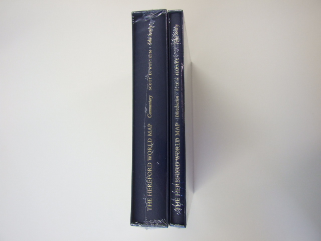 Raw, Stephen - The Hereford World Map: Mappa Mundi Limited Edition (Published in by The Folio Society in 2012. The Hereford World Map, made in around 1300, is recognised by UNESCO as an exceptionally important cultural artefact: the medieval world in one iconic object. Now it is available for you to own in a new reproduction from The Folio Society, limited to 1,000 numbered copies. Printed in 4 colours plus metallic gold, with light-fast ink, on Neobond – a specialist material with exceptional resemblance to vellum. Mounted on a canvas backing woven in England, specially commissioned for this publication. Supported by two battens cut from English oak with a brass D-ring for hanging. Labelled on the reverse with a hand-numbered limitation panel. Map dimensions: 56" x 47.25". Presented in a large wooden map box (51" x 5.5"). Covered with burgundy cloth and lined with fabric. Finished with three brass hinges and two clasps. Blocked in gold with calligraphy by Stephen Raw. Accompanied by two commentary volumes. Introduction by P. D. A. Harvey. Bound in buckram, blocked in gold foil with Merida endpapers and ribbon marker. 112 pages with illustrations throughout. 11" x 8.5". Commentary by Scott D. Westrem. Bound in buckram, blocked in gold foil with Merida endpapers and 2 ribbon markers. 536 pages with 16 pages of colour and black & white illustrations. 11" x 8.5". The Hereford World Map was created by a group of gifted craftsmen and artists. Detailed analysis of the techniques used reveal the hand of a professional scribe (writing both in Anglo-Norman and Latin), at least one artist who drew outlines, another to outline in ink and add colour, and possibly others who drew rivers, mountain ranges and the decorative foliage border. Finally, a professional limner added display lettering in gold in a beautiful Lombardic script. The map was created from a single calf skin of exceptional size and quality, specially treated to preserve its luminous finish. From this splendid base to the carved oak triptych in which the map was displayed, everything about its production suggests an exacting, expensive process that took a year or more to conclude. Other medieval mappae mundi have survived – but none is so large, detailed or elaborately decorated as this. It is quite simply the finest and largest in existence. The map was originally displayed in a large wooden triptych painted with the Virgin Mary on one wing and the Angel Gabriel on the other. It may have been intended as an altarpiece, an aid to preaching or teaching, or both. Certainly the map was not intended to be used as we use maps today. Despite a remarkable wealth of geographical detail, this was not an aid to navigating Europe, or even the Holy Land. At the top of the map's border, Christ sits in judgement over all of God's creation, while the damned and the saved are divided beneath him and Mary prays for those who have sought her intercession. Eden sits just below, while Jerusalem is at the very centre. The legendary cities of Troy and Carthage are marked, as well as the more familiar Venice and Durham. The Minotaur's labyrinth in Crete is shown along with geographical and biblical details like the Nile Delta and the route taken by the Israelites in the desert. Curious human tribes and mythical beasts roam the earth, particularly around its fringes. This, then, is a spiritual and historical map, which conveys the teachings of the Bible and depicts the wonders of history and legend. Cosmological, ethnographical, geographical, historical, theological and zoological information all come together in a single composition, crowned by a religious scene intended to lead the viewer's thoughts to God. This reveals a heroic ambition on the part of the map-makers – to create an encyclopaedia and meditative aid in one beautiful object. For the observer today, it is a fascinating visual narrative in which every detail tells a story. The Hereford World Map has suffered over the years. Over seven hundred years of atmospheric corrosion have reduced its overall colouration to a murky brown. The blue pigment of rivers has flaked away, the green of the oceans darkened, while dirt has smudged and obscured the script and tarnished the gilding. To create this restored reproduction, The Folio Society has used digital technology to peel away the years and reveal, as much as possible, the glory of the medieval original. In it, the background vellum has been cleaned, lettering and drawings strengthened and, most strikingly, the original gilding and spectacular colouring of rivers and oceans have been restored. A careful analysis of pigments, comparison with other medieval maps and the expertise of consultants from the British Library and the Bodleian Library have all been employed to inform the reproduction. To prevent more damage occurring in the future, special light-fast inks have been used. This is by no means an attempt to recreate the original in every particular – some detail is lost for ever – but it is the most authentic version possible. The trustees of Hereford Cathedral have placed the Folio Society limited edition on permanent display beside the original. This will permit generations of future visitors to examine the map in detail and gain an appreciation of its former glory. )