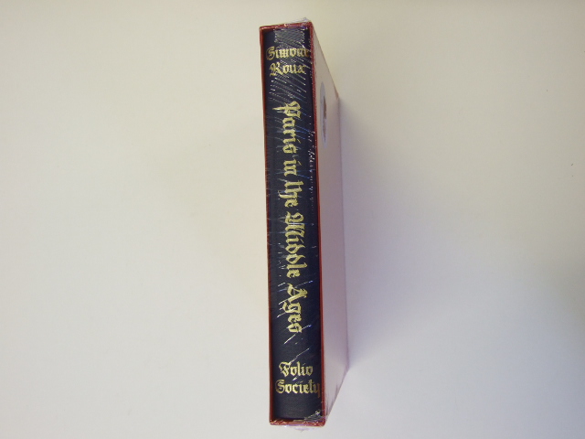 Roux, Simone - Paris in the Middle Ages (Published in by The Folio Society in 2014. Bound in buckram with a Modigliani paper band, printed with a design by Neil Gower. Translated by Jo Ann McNamara. Set in Fournier. 344 pages; frontispiece and 24 pages of colour and black & white plates. Printed map endpapers. 9.5" x 6.5". Introduced by Andrew Hussey. Roux handles with both precision and lyricism the primary sources that tell us about the medieval history of one the world's great cities. This edition features an improved translation and an array of visual material. Where some modern historians delight in imaginative retellings of the past, Simone Roux follows the strictest rigour in using only primary, textual sources for her authoritative account. Yet such is her skill that from censorship rolls or court records she draws stories that bring an entire city to life, and does so, as introducer Andrew Hussey writes, 'with the eye of a poet and an archaeologist'. Roux begins with the physical city of Paris – surrounded by its walls, or the enceinte, first begun in 1190 and then enlarged several times in later years. From there she moves on to the city's people: the hierarchies and the social, political and ecclesiastical figures that connected and divided them. And finally, Roux describes day-to-day life: how people lived and worked, what they ate and wore, their relationships and friendships. The details she elicits offer a fascinating, varied picture, from a street brawl where two neighbours beat one another with bread to an extravagant gown belonging to the Duke of Orleans, covered with the notes and lyrics of a love song stitched out in pearls. Illuminations from contemporary manuscripts depict Paris, dominated by the bulk of Notre-Dame. In details of these we see, amongst others, a money-changer, a picklock, a watchman, and a ferryman bringing a boatload of melons to the city. The book's endpapers are printed with a 15th-century map, and we have also commissioned a new map to show the 13th-century city. With a newly commissioned index and improved translation, this Folio edition provides a key to Paris's past. )
