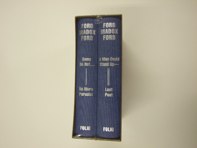 Ford, Ford Madox - Parade's End 2 Volume Set (Published in by The Folio Society in 2014. Introduced by Philip Hensher. Illustrated by James Albon. A modernist masterpiece, Ford Madox Ford's Great War tetralogy is vividly evoked in this striking two-volume edition. Chronicling the wartime experiences of Christopher Tietjens, a brilliant government statistician and wealthy landowner, Parade's End is a portrait of British society during the First World War. Described by Ford as the 'last English Tory', Tietjens is torn between his scheming and promiscuous socialite wife Sylvia and the progressive Valentine Wannop, a pacifist and suffragette — relationships framed by his reliance on a crumbling moral code. Ford presents a gritty and uncompromising portrait of Tietjens's life in the trenches of Belgium and France, and his subsequent return home, suffering from crippling shell shock. Through a narrative brimming with modernist experimentation, we follow his struggle to reconcile his relationships while navigating the shifting sands of an evolving social order. The text in this edition follows the definitive Carcanet Press edition. Quarter-bound in cloth with paper sides, printed with a design by James Albon. Set in Photina. 1,128 pages in total with 22 colour illustrations. Frontispiece in each volume. Book size: 9.5" x 6.25". A 20th-century masterpiece of love and betrayal. Ford Madox Ford was one of the most versatile and prolific of the great modernist writers. It is said that he wrote 1–2,000 words each day of his life, producing almost 80 books that spanned a variety of genres and often pushed the boundaries of form and style. No other does this more than Parade's End. This extraordinary four-novel series, published between 1924 and 1928, chronicles the social upheaval wrought by the First World War. But it is equally an exploration of the nature of time, memory and relationships, presented through a deft stream-of-consciousness narrative. At its centre is Christopher Tietjens, a Yorkshireman and 'the last English Tory', who is transported from the predictable hierarchies of Edwardian Britain to the chaos of the trenches, all the while tormented by his sadistic wife Sylvia, who Graham Greene described as 'surely the most possessed evil character in the modern novel'. Ford wanted to be 'the historian of his own time'. Here, he achieved his goal, and in doing so produced a series of great experimental novels. 'There are not many English novels which deserve to be called great: Parade's End is one of them'. W. H. Auden. Ford's prose is brimming with subtle observations about relationships and a Freudian sense of character rarely displayed by British writers of his time. Adapted by Tom Stoppard in 2012 for an acclaimed BBC/HBO television series, Ford's second masterpiece, after his 1915 novel The Good Soldier, is undergoing a richly deserved revival. Ford is astonishingly perceptive in his presentation of British society as it evolved during and after the war. Like his protagonist, he was known for his phenomenal memory, and he was exceptionally attuned to the class distinctions of the times in which he lived. He also drew on his wartime experiences; he worked for the War Propaganda Bureau and then enlisted, partly to evade his then-girlfriend Violet Hunt, whose wrathful nature influenced the character of Sylvia. A shell explosion concussed him during the Battle of the Somme, an experience mirrored by Tietjens's shell shock. He was eventually invalided back to Britain and began writing Parade's End while convalescing in France. Just as compelling as the novel's decade-spanning landscape is Ford's portrayal of the pensive, highly intelligent, emotionally reticent Tietjens. Few novels have a principal character whose consciousness is so fully expressed, nor convey with such accomplished, artful confusion the complex interrelation of our inner and outer worlds, and the anxieties, misperceptions and contradictions that beset our relationships. Some Do Not opens in England in 1912. Tietjens is a young government statistician, admired for his brilliance but with a personal life teetering on the brink of scandal, thanks to his wife's promiscuity and his own growing attachment to suffragette Valentine Wannop. No More Parades and A Man Could Stand Up— are set largely on the Western Front, where Tietjens has been stationed. He is determined to be with Valentine, but Sylvia's machinations intensify as she seeks the ruin of the husband she desires and loathes in equal measure. The Last Post draws the tetralogy to a bold and poignant close, occupying just a few hours of a summer's day after the war. Ford moves between the thoughts of multiple characters, offering a fascinating, splintered view both of the protagonist and the post-war era. 'Virtually alone of the male writing of the 1920s in affirming the ascendance of women and advocating a course of graceful withdrawal from dominance for men'. David Ayers. Trenches and socialites - illustrating Parade's End. Ford Madox Ford (1873 – 1939). From the Folio Society description. )