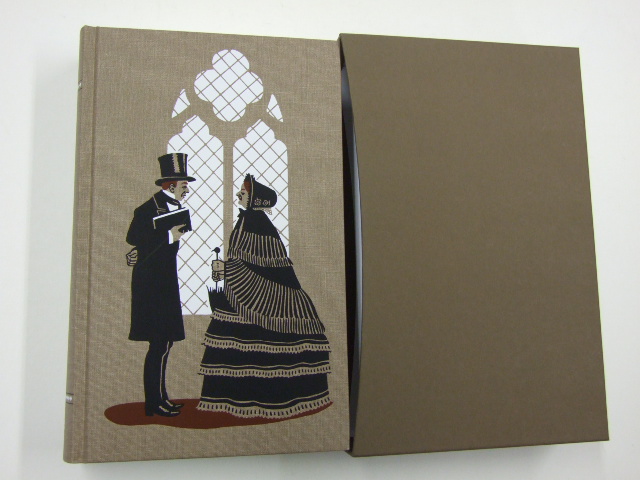 Trollope, Anthony - Barchester Towers Illustrated by Bill Bragg (Published in by The Folio Society in 2014. Introduced by Kathryn Hughes. The most celebrated of Trollope's Barsetshire novels is vividly brought to life by Bill Bragg's characterful illustrations. Till we can become divine, we must be content to be human, lest in our hurry for a change we sink to something lower. When the kindly old bishop of Barchester dies, he does it at a most inconvenient time. The political ministry has changed, and instead of the mitre being offered to his son, the stern Dr Grantly, it goes to the ineffectual Proudie and his insufferable wife. In their wake comes the vile, power-hungry Obadiah Slope, determined to win himself a wealthy wife and to interfere in every aspect of church life. Barchester will never be the same again. Barchester Towers book. Bound in cloth, blocked with a design by Bill Bragg. Set in Garamond. 544 pages; frontispiece and 9 colour illustrations. Printed map endpapers. 9.75" x 6". The story of Barsetshire continues. Barchester Towers continues the story of Eleanor and her father Septimus Harding from The Warden, but it introduces a host of other characters, delightfully comic and appalling by turns. The manipulative Signora Madeline Vesey Neroni, who reclines on a sofa all day, but ensnares plenty of hearts; the anxious Mrs Quiverful with her 14 children to maintain; Miss Thorne, obsessed with reviving the art of jousting… The inhabitants of Barchester are irresistible, and never more so than when they are locked in furious struggle. No one dissects 19th-century English society and the machinations of Church politics with more subtlety and humour than Trollope. In this, one of his finest works, he exposes the absurdities and vanities of both parties. Yet while his pen is razor-sharp, his heart is gentle – Trollope always shows the reader the kinder values that should prevail, as they do in the happy ending he offers to his best-loved characters. 'One of the most acute and humane chroniclers of public and private life in the High Victorian period'. KATHRYN HUGHES. Click here to read a blog post by the illustrator, Bill Bragg. The Case of the Moving Cathedral: Mapping Trollope's Barsetshire. 'I almost fear', wrote Anthony Trollope in Framley Parsonage, 'that it will become necessary, before this history be completed, to provide a map of Barsetshire for the due explanation of all these localities.' In his Autobiography, Trollope reveals that he began work on such a map during the writing of Framley Parsonage (1860). Yet Trollope's sketch did not come to light until 1927, when it was reproduced in Michael Sadleir's Trollope: A Commentary. Before 1927, Trollope scholars had puzzled over the inconsistencies within the Barsetshire novels, in which the wealth of geographical detail is sometimes vague or contradictory: the eagleeyed reader will notice a moving cathedral, a shrinking distance between two villages and a railway with an implausible detour built into its tracks. . . Ronald Knox, who continued Trollope's Barsetshire narrative in his own novel Barsetshire Pilgrimage (1935), first mapped the fictional county in 1922. American enthusiast Spencer van Bokkelen Nichols published his critical essay 'The Significance of Anthony Trollope' in 1925, featuring a map based on his research into the texts and painted by George F. Muendel. When Trollope's sketch was published, various differences between this and earlier maps were immediately clear, most noticeably the placing of Greshamsbury, which Nichols and Knox located in west Barsetshire, but which Trollope drew in the east. The map reproduced as endpapers to the Folio edition is based on Trollope's sketch and was drawn by Lynton Lamb, an English author, lithographer and illustrator who designed book covers, postage stamps and posters, and exhibited at the 1951 Festival of Britain. The jewel in the Trollopian crown. 'In the writing of Barchester Towers I took great delight,' recalled Anthony Trollope in his Autobiography and, indeed, you can feel that pleasure bubbling up in every line of the book. Barchester Towers is not a cruel or satirical cackle so much as a gentle pondering of the absurdities of life, whether or not you happen to wear a clerical collar or know someone who does. Who can forget the great comic creations of Mrs Proudie, the interfering bishop's wife, or Obadiah Slope, her appalling chaplain who oozes clamminess and spiritual pride? And then there are all those other Barchestonians, associated with the Church by community and familial ties, who are struggling to come to terms with the blistering pace of social and institutional change. Some characters, like Francis Arabin, will accommodate themselves to the new order without compromising themselves, others, like Miss Thorne, the squire's sister, will find themselves forever bewildered and left behind. Trollope charts their journeys with a blend of perception and empathy that gives a sense of wholeness to the book. For many devoted readers Barchester Towers is quite simply the jewel in the Trollopian crown. . An extract from Kathryn Hughes's introduction. From the Folio Society description. )