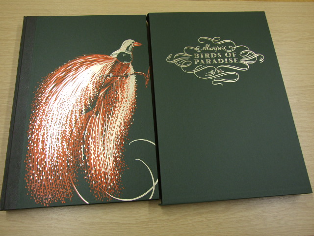 Sharpe, Richard Bowdler - Sharpe's Birds of Paradise Limited Edition (Published in by The Folio Society in 2011. A Folio Society limited edition. Introduced by David Attenborough. The Folio Society is proud to reproduce, for the first time, all 79 plates of Sharpe's Birds of Paradise in book form at their actual size, with a foreword by David Attenborough. Limited to 1,000 numbered copies and 20 lettered copies. Sharpe's Birds of Paradise. The Folio Society is proud to reproduce, for the first time, all 79 plates of Sharpe's Birds of Paradise in book form at their actual size, with a foreword by David Attenborough. At the time when this remarkable book was first produced, lithographic plate reproduction had reached its peak of subtlety and precision. The illustrations showed these fabulous birds in radiant colour and exquisite detail. With this edition, you now have the opportunity to own an extraordinary work of natural history. Production Details. Sharpe. Plates Volume:. 79 colour plates. Foreword by David Attenborough. 21.5" x 15". Quarter-bound in goatskin leather. Canvas cloth sides blocked with a design by Neil Gower. Gilded top edge. Ribbon marker. Cloth-bound slipcase. Blocked in gold. Commentary Volume:. 292 pages. Bound in canvas cloth with inset title label. Book Size: 9.5" x 6.25". An extraordinary work of natural history. . With their extravagant, sweeping plumage and glorious iridescent colours, birds of paradise appear almost mythical: indeed it was once thought that they lived entirely in the air, only falling to the ground when they died. Their plumes have been exchanged as currency and worn in sovereigns' crowns, and they played a part in helping Darwin, together with A . R. Wallace, formulate his theory of evolution. At the end of the 19th century, Richard Bowdler Sharpe published his Monograph of the Paradiseidae and Ptilonorhynchidae. Dedicated entirely to birds of paradise and bower-birds, it is one of the greatest bird books and, for many, the most beautiful ever created. 'The Folio Society has produced a truly remarkable edition of one of the greatest of all bird books. Birds of paradise are among the most spectacular and colourful creatures on earth, and this book displays them in all their extraordinary beauty and variety'. DAVID ATTENBOROUGH. At the time when Sharpe's Birds of Paradise was produced, lithographic plate reproduction had reached its peak of subtlety and precision. The illustrations showed these fabulous birds in radiant colour and exquisite detail. Their beauty is breathtaking – from the Great Sicklebilled Bird of Paradise, with its shimmering plumage and long, sweeping tail feathers, to the Emperor Bird of Paradise with its foamy white and golden plumage. The book is an ornithological and artistic triumph. David Attenborough has written a foreword to this new Folio Society edition, in which he gives a fascinating account of the spell these birds have cast across the centuries, prized by every society that came across them, from indigenous tribes of New Guinea to the King of Siam. More personally, they are prized by Attenborough himself, who first came across this book in a library as a boy: 'I was astounded then by the birds' beauty. And I am in thrall to them still.'. 'A grand finale to a glorious episode in publishing history'. ERROL FULLER. The 19th century saw a rapid evolution in the publication of natural history books. Magnificent large-scale tomes, sumptuously bound and illustrated with hand-coloured plates, celebrated all the latest discoveries of exotic birds and animals around the world. Richard Bowdler Sharpe was Assistant Keeper of the British Museum's Zoology Department, and had collaborated with John Gould on The Birds of New Guinea. Following Gould's death in 1881, Sharpe set out to create an entirely new work dedicated entirely to birds of paradise and to bower-birds, then thought to be related to birds of paradise. A triumph of art and ornithology. Sharpe chose John Gerrard Keulemans and William Matthew Hart as the artists for the project. Both were specialists in the subject; many of Keulemans's works can still be found on display in the American Museum of Natural History. Once printed, the plates were coloured in by hand, a laborious and skilled process. Three of Sharpe's daughters were colourists who had worked on other ornithological books, and it is possible that they contributed to their father's masterpiece. Certainly the hand-colouring is of a quality and sophistication that mark the culmination of a great tradition, evincing skills that modern practitioners find impossible to match. Sharpe's original text in a separate commentary volume. Painter and naturalist Errol Fuller is the foremost authority on Sharpe. In his introduction to the commentary volume he explores the historical context of Sharpe's project, noting how Sharpe chose 'the perfect group of birds – spectacular in every way – to bring about a grand finale to a glorious episode in publishing history.' )