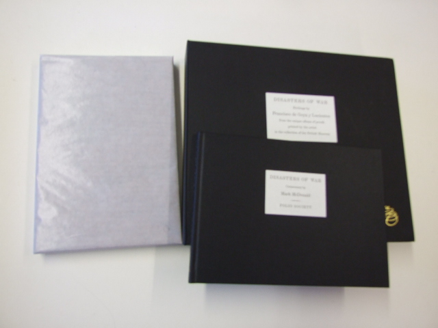 Goya - Goya: Disasters of War Limited Edition (Published in by The Folio Society in 2014. The first edition to reproduce Goya's own prints of these momentous etchings. Facsimile volume - Edition limited to 980 hand-numbered copies. 11.75" x 8.25". 176 pages with 85 illustrations. Printed on Insize Chagall Candido. Endpapers hand-marbled by Jemma Lewis. Bound in full leather with a gold-blocked leather titling label on the spine. Goya's signature printed on bottom page edges. Commentary volume. 11.75" x 8.25". 72 pages with 23 integrated colour illustrations. Set in Bell with DeVinne display. Printed on Veltique paper. Bound in Balmoral cloth with letterpress printed label on front board. Blocked on spine and front board. . Solander Box. Balmoral cloth with Wibalin lining. Letterpress label inset on front board. 'Fatal consequences of the bloody war in Spain with Bonaparte, and other emphatic caprices' was the title of the manuscript Francisco de Goya gave to his friend Ceán Bermúdez an art critic and collector. This collection of 85 etchings contained some of the most powerful images of the horrors of war ever created and is now considered a forerunner of modern war reportage. This facsimile is the first reproduced from those proofs and thus bears the closest likeness to Goya's conception of the Disasters. The images in the Disasters of War were created over the period of a decade. For each, Goya created preparatory drawings, mostly in red chalk, some in ink and wash. When working on the etchings he experimented with copper plates of varying size and a range of papers and inks. Almost 500 individual proofs of the Disasters survive; however, the one set which can be regarded as definitive is contained in the album that Goya gave to his great friend Ceán Bermúdez, titled on the spine – somewhat confusingly – 'Capricho de Goya'. Now housed in the British Museum, it provides information about Goya's intentions not found anywhere else. It alone bears Goya's original title for the work, his signature, written on the closed page edges of the album, and the captions for each etching, hand-written in pencil by the artist himself. This facsimile is the first reproduced from Goya's proofs, and thus bears the closest likeness to Goya's conception of the Disasters. To achieve an exact match with the originals, four printings were employed, comprised of a pale cream to match the paper shade and three different blacks which together give the intensity and tonal variety of the original prints. The antique laid paper is also as close a match as possible to that used by Goya. )