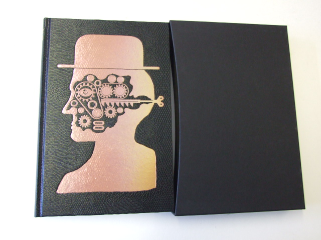 Burgess, Anthony - A Clockwork Orange (Published in by The Folio Society in 2014. Burgess's iconic novel, presented in a new edition introduced by Irvine Welsh. 'Goodness is something chosen. When a man cannot choose he ceases to be a man.' So says the prison chaplain, perhaps the only voice of reason in Anthony Burgess's most celebrated work. Both a horrific satire of youth culture and an ingenious examination of social justice and government control, A Clockwork Orange has left an indelible, boot-shaped mark on the popular and literary culture of the late 20th century. Stanley Kubrick's notorious 1971 film — with its iconic imagery and enduring controversies — has overshadowed a work whose philosophical paradoxes and astonishing linguistic invention are some of literature's most inspired. Bound in textured paper, blocked with a design by Ben Jones. Set in Bembo with Shelton Slab display. 240 pages; frontispiece and 6 colour illustrations. 9.5" x 6.5". Plain Black Slipcase. )