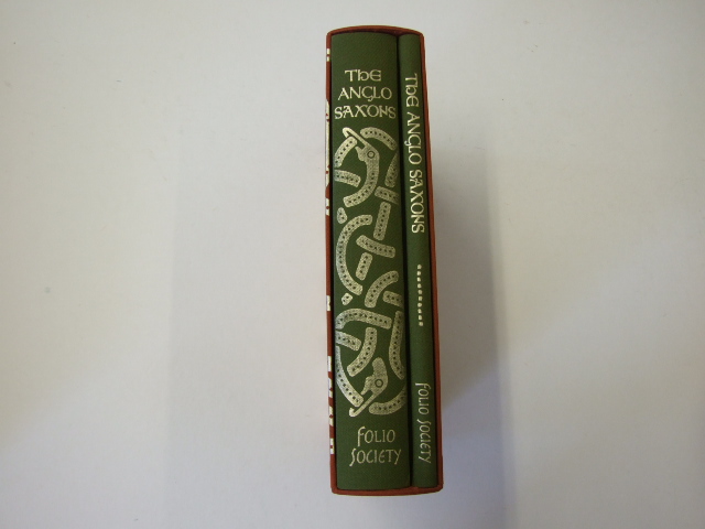 Campbell, James - The Anglo-Saxons (Published in by The Folio Society in 2018. Introduced by Gareth Williams. Still one of the most influential books in its field, Campbell's account of six hundred years of power struggles, blood-feuds, conquest and gold hoards is now vividly portrayed by Folio with full-colour photographs. In just six centuries, the Anglo-Saxons established English as the common language, introduced Christianity and universal coinage; and sustained several waves of Viking invaders, including an invasion in the 9th century that was thwarted by the self-proclaimed King of England, King Alfred. By the end of the period, they had successfully created a unified Kingdom of England with borders that are largely unchanged to this day. James Campbell's The Anglo-Saxons remains the authoritative title despite the publication of subsequent books on the period. Written by one of the leading Anglo-Saxon scholars, it is a remarkable history created for a general readership. Campbell's ground-breaking pictorial volume includes maps and diagrams, as well as over 60 black and white photographs of archaeological sites and surviving defences and churches. Campbell placed art and craftsmanship at the forefront of his work and these images illustrate their importance in understanding Anglo-Saxon culture. Two volumes. Bound in blocked cloth. Set in Minion Pro. Text volume: 432 pages. Picture volume: 104 pages. 67 integrated black & white photographs and 15 maps in volume 1; 136 colour photographs in volume 2. Gilded page tops. Blocked cloth slipcase. 10" × 6.75". )
