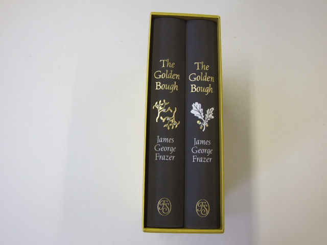 Frazer, Sir James George - The Golden Bough - A Study of Religion and Magic (Published in by The Folio Society in 2018. James George Frazer's monumental classic, The Golden Bough – a subversive study of religion and folklore that scandalised its first readers – in a lavishly illustrated Folio edition. Over 125 years after it first appeared, The Golden Bough remains a uniquely disturbing masterpiece – a groundbreaking exploration of the twisted roots of magic, ritual and religious belief, and a transformative influence for writers from Eliot to Hemingway, Lovecraft to Freud. Bound in printed and blocked cloth with designs by Romy Blümel. Set in Miller Text. Volume one, 464 pages; volume two, 520 pages. Frontispiece and 72 pages of colour and black & white plates. Blocked slipcase. Gilded tops 10" x 6.75". The life-work of James George Frazer (1854–1941), a pioneering Cambridge University anthropologist, The Golden Bough set out to elucidate a mysterious Roman tradition: that a runaway slave could inherit the priesthood at the shrine of Nemi by chopping a branch from a nearby sacred tree, then murdering the incumbent. To unravel this conundrum, Frazer embarked on a virtual 'voyage of discovery' into a dark world of fertility rites and human sacrifice, sacred kings and dying gods. Pushing the comparative method to its limits, he set myths and rituals from ancient Egypt, Greece and Rome alongside Christian practices, and 19th century observations of tribal beliefs against the residual folk traditions of late-Victorian Britain – with startling results. On the surface, The Golden Bough provides a comforting Darwinian account of humanity's progress from an Age of Magic, through an Age of Religion and on to an Age of Science. But other unnerving conclusions gradually emerge: that the superstitions that Frazer catalogues still bubble dangerously beneath an easily cracked veneer of rationality, and the thought-processes of the reader and primitive man share an unexpected 'essential similarity'. Even more alarming, he presents shocking parallels between tribal rituals, ancient religious ceremonies and key components of Christianity, including its festivals, its sacraments, and even the narrative of Christ's crucifixion and resurrection. )