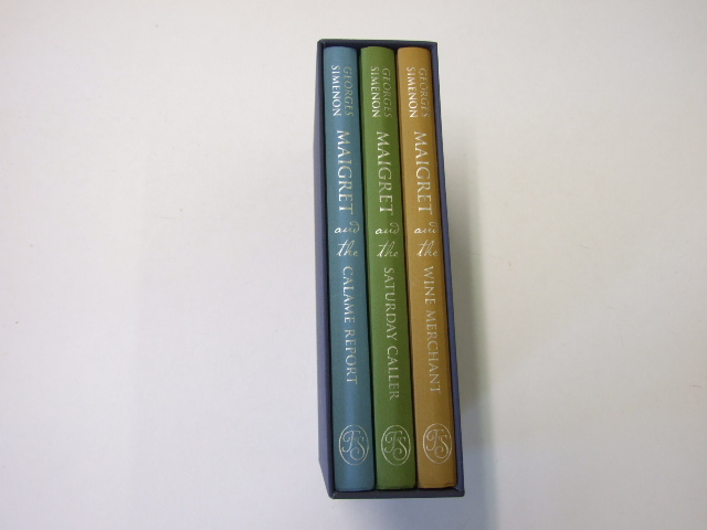 Simenon, Georges - Maigret Set One Maigret and the Calame Report, Maigret and the Saturday Caller, Maigret and the Wine Merchant (Published in by The Folio Society in 2018. The first Folio Maigret collection brings together three of Georges Simenon's engrossing detective novels, alongside woodcut illustrations by the great Harry Brockway. The quintessential French detective returns in this irresistible three-volume collection of classic crime novels, each carefully chosen by The Folio Society editors to represent the very best of Jules Maigret. Bound in printed and blocked cloth. Set in Garamond with Trajan as display. 504 pages in total. Frontispiece and 4 integrated black & white woodblock illustrations in each volume. Spotted Eco endpapers. Blocked cloth slipcase. 8.75" x 5.5". )