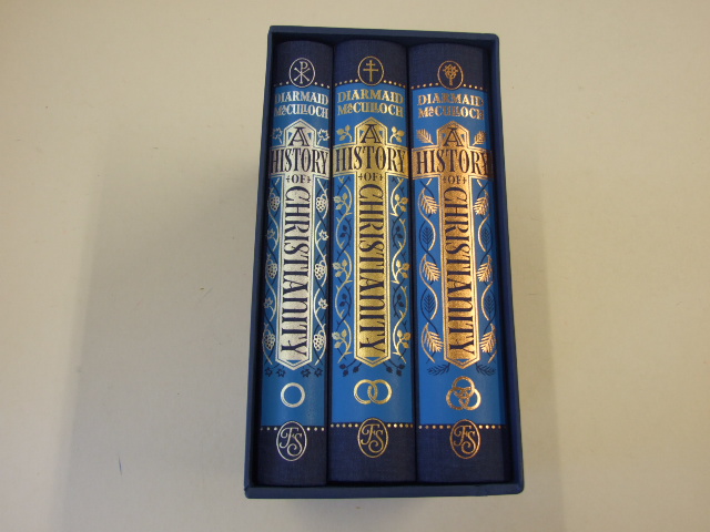 MacCulloch, Diarmaid - A History of Christianity The First Three Thousand Years (Published in by The Folio Society in 2020. A beautiful three-volume Folio edition of Diarmaid MacCulloch's epic history of Christianity – a landmark of scholarship presented with superb colour images and an exclusive new introduction from historian Neil MacGregor. Three volume set. Bound in cloth blocked with designs by Jamie Clarke. Set in Minion. Vol 1: 408 pages, Vol 2: 536 pages, Vol 3: 576 pages. 32 pages of colour illustrations per volume. 25 integrated black & white maps across the three volumes and decorative title pages. Blocked slipcase. 10" x 6.75". How did an obscure sect in first-century Palestine flower into the religion of a third of the world? In a work of astonishing scope, Diarmaid MacCulloch begins the story 1,000 years before the birth of Christ. His acclaimed, commanding history takes in apostles and martyrs, lost kingdoms and empires, crusades and liberation struggles, the architecture of soaring Gothic cathedrals and the genesis of the greatest works of sacred art and music. This superb three-volume Folio edition features an entirely new introduction by historian Neil MacGregor, bestselling author of A History of the World in 100 Objects, and each volume includes 32 pages of stunning colour images. The bindings and slipcase are adorned with exquisite designs by typographer Jamie Clarke, depicting three crosses from different ages of Christianity. )