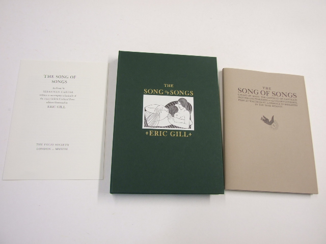 Illustrated by Eric Gill - The Song of Songs Limited Edition (Published in by The Folio Society in 2022. A classic from the Fine Press tradition. Limited to 750 hand-numbered copies. Published in series with Genesis and The Book of Jonah. The Song of Songs is the most sensual book of the Bible, an often explicit dialogue between two devoted lovers. This 1925 edition was Gill's first major work for the Golden Cockerel Press, his earliest attempt to illustrate a biblical narrative, and an ideal vehicle for his unique religious and erotic interests. 44 pages, set in Caslon type, with 19 wood-engravings by Eric Gill. Bound in oatmeal cloth blocked in gold on the spine. Taupe paper dust wrapper, printed in black ink, and featuring an illustration by the artist in facsimile of the original. Reproduced from the first edition, this book has been printed on Corolla Book Laid Ivory paper in black ink with some letters picked out in red. Accompanying the facsimile is an essay by Sebastian Carter, formerly of the Rampant Lions Press, now editor of Parenthesis, the Journal of the Fine Press Book Association. This specially commissioned piece gives essential background to the original publication and is printed in Caslon on Corolla Book Laid Ivory paper. The solander presentation box is covered in dark green Wibalin paper and lined with a paler green Surbalin paper. The front and spine are blocked in gold foil and the front board is inset with a title label printed in black with an illustration by Eric Gill on Corolla Book Laid Ivory paper. )
