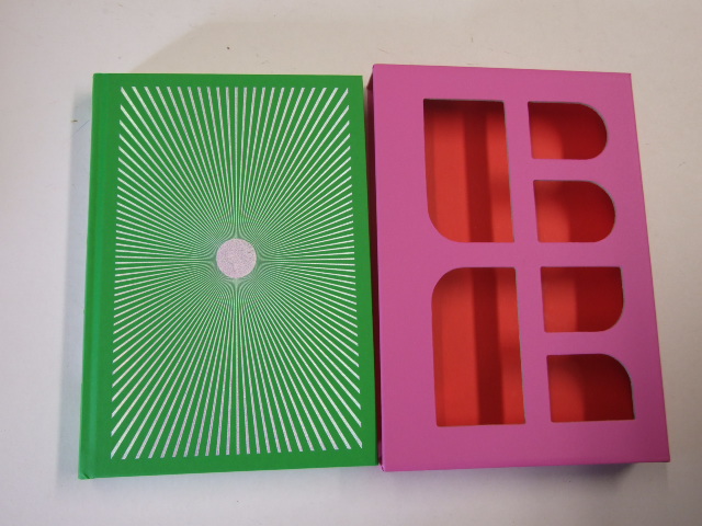 Dick, Philip K. - Ubik (Published in by The Folio Society in 2019. Bound in blocked vinyl-coated paper. Set in Utopia with Helvetica Neua as display. 224 pages. Frontispiece and 7 colour illustrations. Printed endpapers. Die-cut slipcase with printed insides. 9" x 6.25". Philip K. Dick's celebrated science-fiction thriller leaves readers guessing until the very last page. This spectacular Folio Society edition of Ubik features a new introduction by award-winning writer Kim Stanley Robinson. Inspired by Dick's ability to break new ground with every story, Folio' edition of Ubik pushes the boundaries of book design and science-fiction art. Featuring a series of bold hypnotic illustrations by award-winning independent art studio La Boca, this volume is presented in a special die-cut slipcase that combines with the vibrant binding to confuse the eye. )