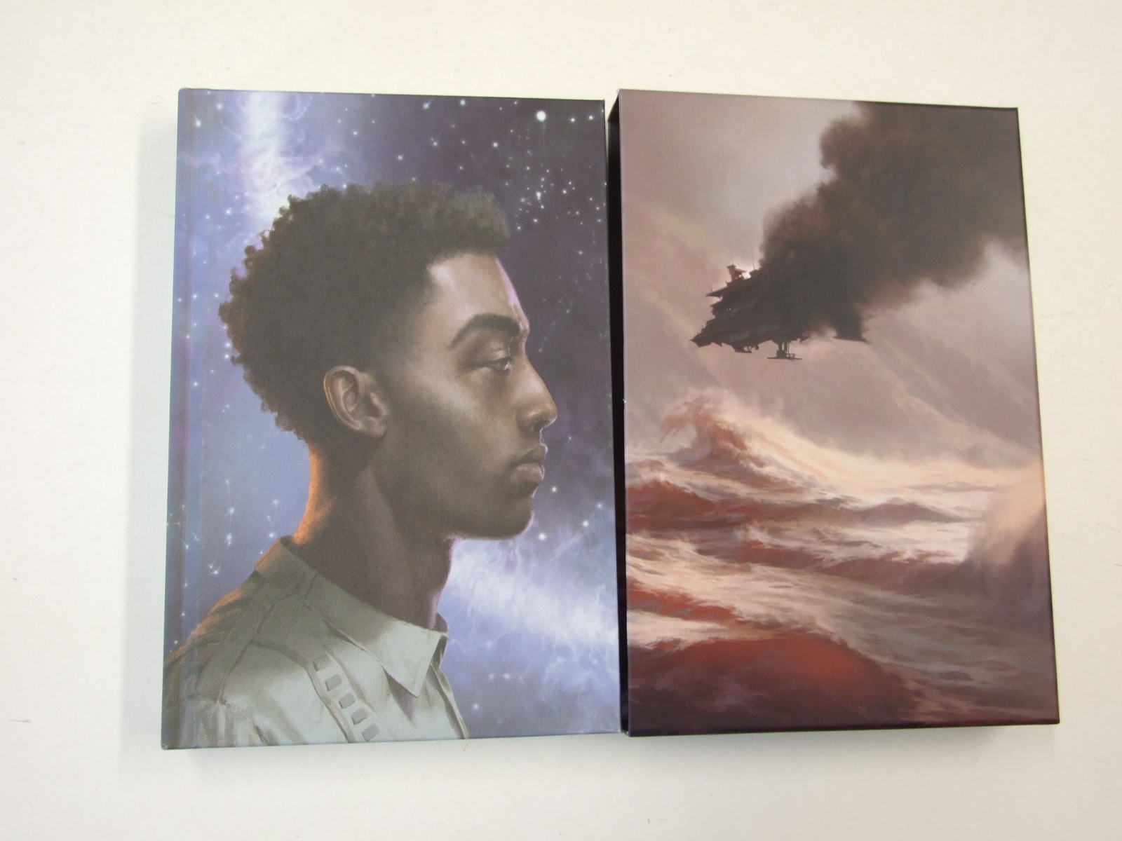 Clarke, Arthur C - Childhood's End (Published in by The Folio Society in 2023. Illustrated by Grace Aldrich. Foreword by Arthur C. Clarke. Preface by the author. Arthur C. Clarke's seminal sci-fi novel Childhood's End charts a utopian alien invasion with a surprising twist. This beautiful new edition features the spectacular artwork of Grace Aldrich. It is the late 1970s and the United States and Soviet Republic are on the cusp of entering outer space. However, just as space travel is within their grasp, alien spaceships descend over the earth's major cities ... five years later, the Overlords have taken over the world. American illustrator Grace Aldrich elevates the tension and uneasiness in the narrative to present the strange new reality in six unnerving illustrations, while her striking binding design features the pivotal character, Jan Rodricks. Bound in printed and blocked cloth. Set in Berling with Helvetica as display. 248pp. 5 full-page colour illustrations. Black & white illustrated title page spread. Slipcase printed and matt laminated. 9.5" x 6.75". )