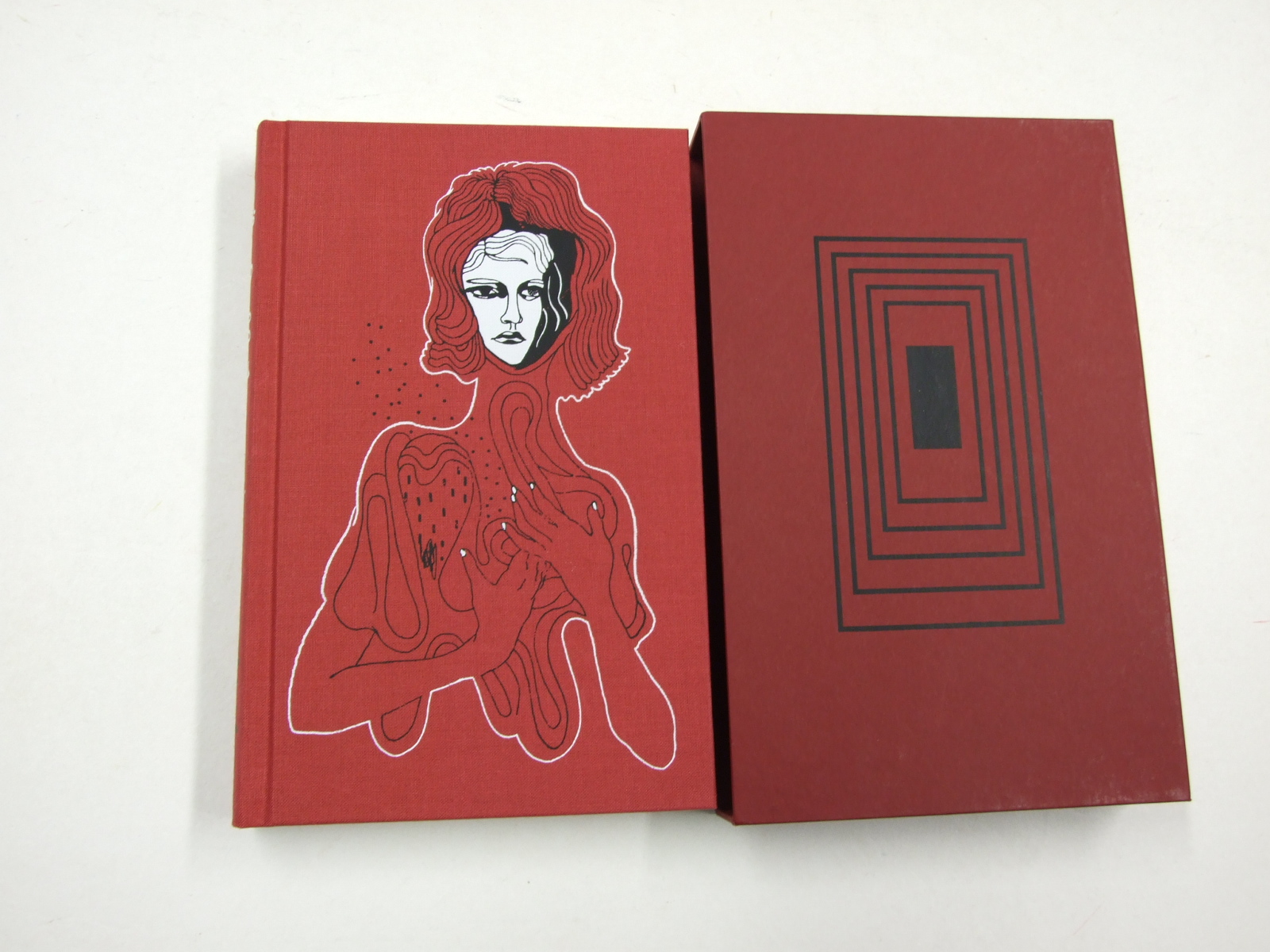Plath, Sylvia - The Bell Jar (Published in by The Folio Society in 2022. Illustrated by Alexandra Levasseur. Introduced by Heather Clark. A witty and melancholic portrayal of 1950s New York set against the backdrop of mental illness, Sylvia Plath’s The Bell Jar is newly introduced by Plath biographer and scholar, Heather Clark, and features seven ethereal illustrations by Alexandra Levasseur. Achingly sad, darkly humorous and engaging, The Bell Jar is a beautifully written coming-of-age novel. This startling new edition celebrates its literary status and timeless subject matter. Plath biographer Heather Clark has written a fascinating new introduction exploring the author’s life, and the edition is sensitively illustrated by painter and sculptor Alexandra Levasseur. The Bell Jar brought mental health and the feminist agenda to the fore through the frustrated eyes of an aspiring writer trying to be taken seriously in misogynistic 1950s America. When exploring Esther’s spiralling descent into breakdown, Plath’s quick wit and wry observations were viewed by some critics as flippant, and the novel courted controversy for its supposed glamourisation of mental illness. As a mirror of the author’s life, it is a raw and real insight into a journey that is not exclusively harrowing and painful; there is hope and happiness too. Bound in blocked cloth. Set in Verdigris. 248 pages. Frontispiece and 6 colour illustrations (including a double-page spread). Blocked slipcase. 8 .75" x 5.5". )