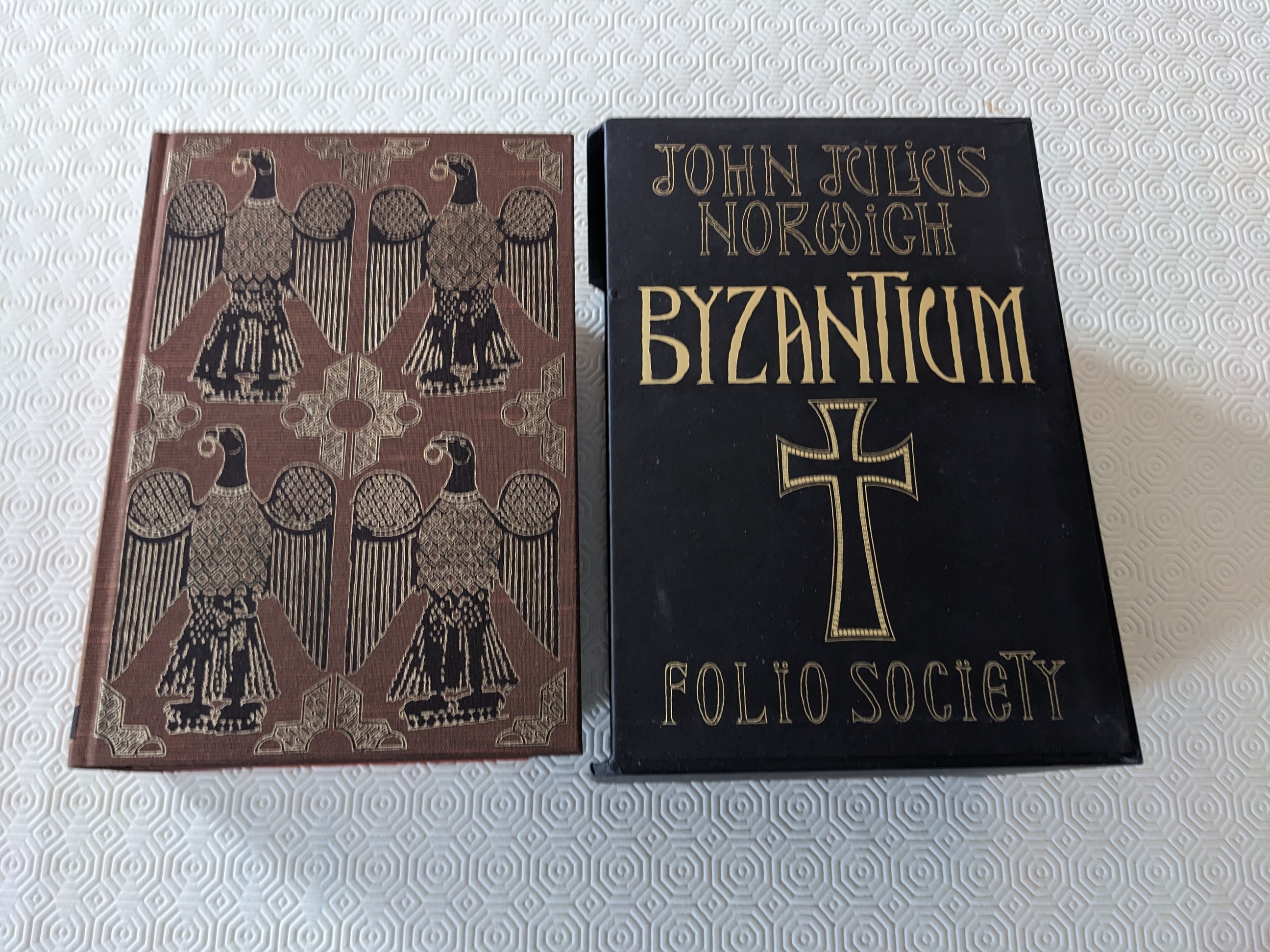 Published in London by Folio Society. 2003. First Thus. 3 Fine Hardbacks. No inscriptions or bookplates. Near Fine slipcase. Slight marks to panels of slipcase. This sweeping history spans more than 11 centuries including the ideas and the people who are at the heart of the story of Byzantium. 412pgs, 450pgs, 537pgs. Bound in Serana cloth blocked with individual designs by Neil Packer. 1,480 pp in total with 25 pp of colour illus. in each volume. Map endpapers. When Constantine the Great finally gained sole control of the ailing Roman Empire in AD 323, he had no doubts about where to build a new capital: the ancient Greek city of Byzantium. The story of its spectacular rise and fall is one of the most compelling in the history of civilisation.