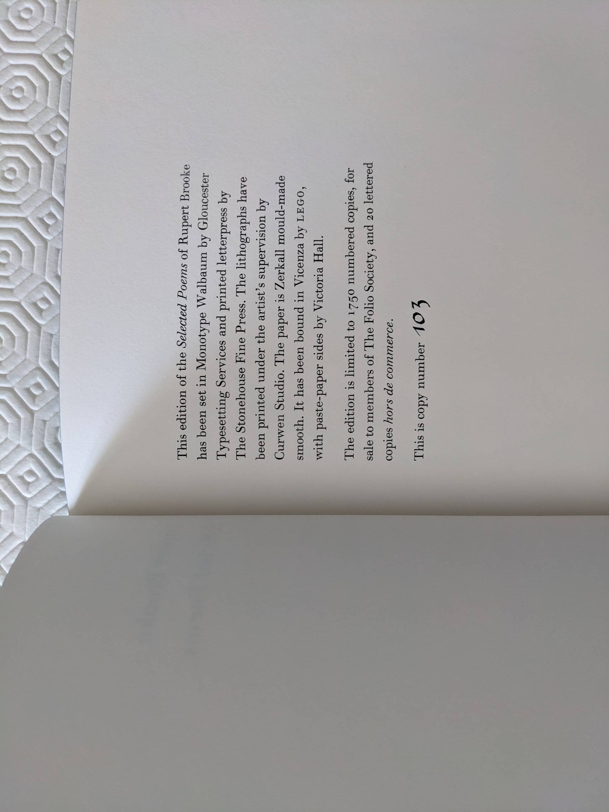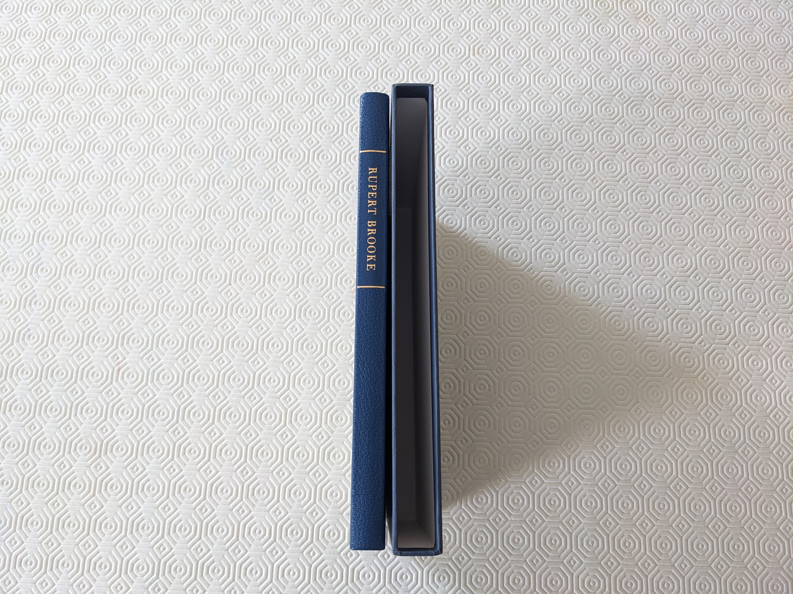 Published in London by Folio Society. 2015. First Thus. Fine Hardback. No inscriptions or bookplates. Fine slipcase. 118 pages. 9¾" x 7". 9 original lithographs and 6 letterpress vignettes by Ed Kluz, printed by Curwen Studios. Typeset in Monotype Walbaum by Stan Lane at Gloucester Typesetting Services and printed letterpress at The Stonehouse Fine Press. Printed on Zerkall mould-made smooth paper with Freelife Merida endpapers. Bound in Vicenza by LEGO, with paste-paper sides by Victoria Hall. Slipcase covered in Freelife Merida, blocked on one side, with a lithograph label. A selection of Rupert Brooke’s most famous poems, presented in a special limited edition to mark the centenary of his death. The book has been designed to reflect the values of the fine press movement of the early 20th century: the text is printed letterpress, illustrated with original lithographs and bound in leather with handmade paste-paper sides. Brooke is famous both for his evocation of Edwardian England in poems such as ‘The Old Vicarage, Grantchester’ and for the wide-eyed patriotism of his later poems that herald the coming conflict. He died aged 27, before this illusion of a just and heroic war was completely shattered, although his final poem suggests that he may have begun to reconsider his idealistic stance. This edition contains superb new lithographs that capture the vitality and beauty of his verse. Like so many others of his time, Rupert Brooke did not live to reach his full potential, but his haunting, often prescient poems testify to his dazzling command of words and the depth of his imagination. Limited to 1,750 numbered copies of which this is number 103.