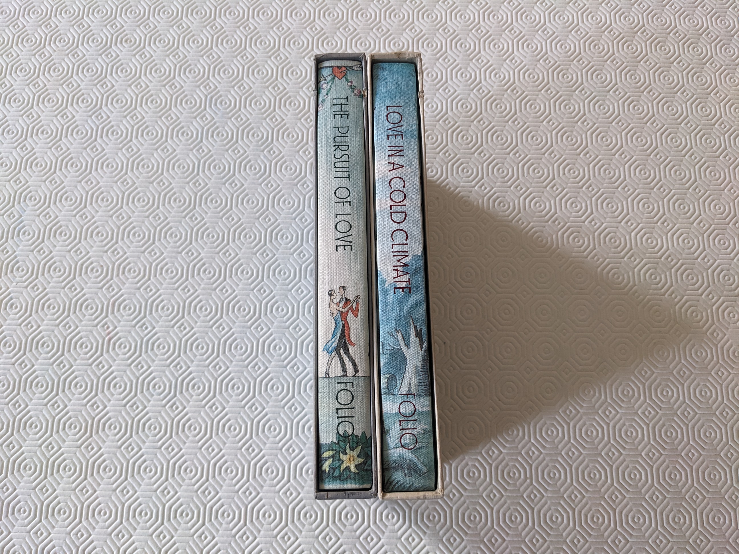 Published in London by Folio Society. 1991. First Thus. Near Fine Hardbacks. Page edges slightly marked. Previous owner name on front free endpaper of Cold Climate; previous owner bookplate on front free endpaper.of Pursuit of Love. Very Good slipcase. Some marks and fading to panels of slipcases. Illustrated by Roland Pym. Both first printings; Pursuit of Love 1991, Cold Climate 1992.