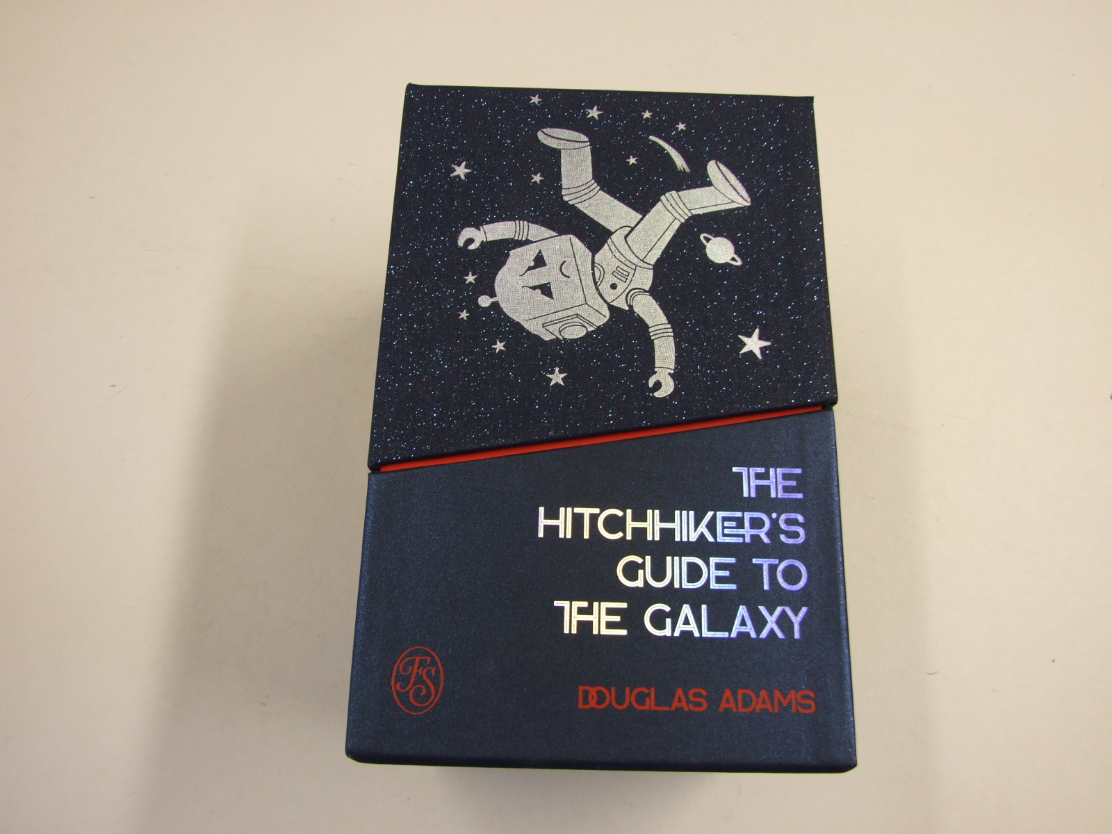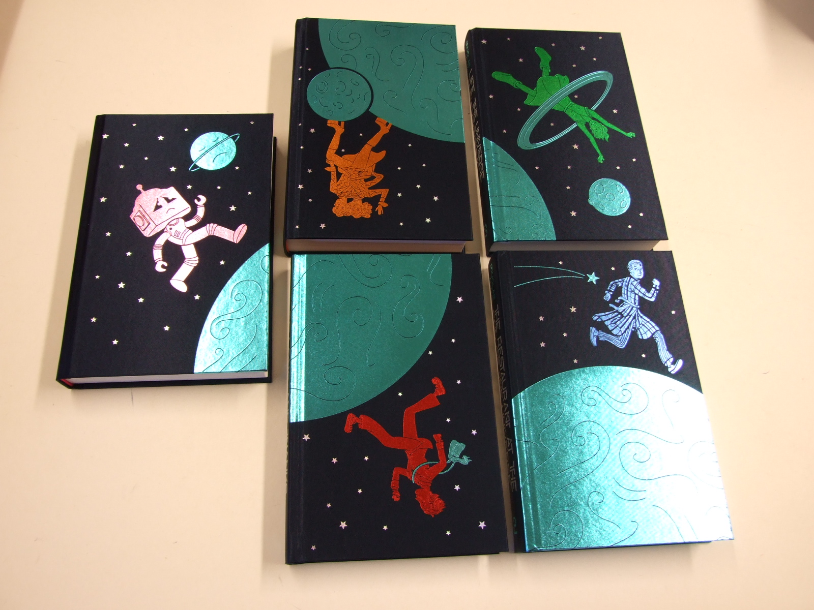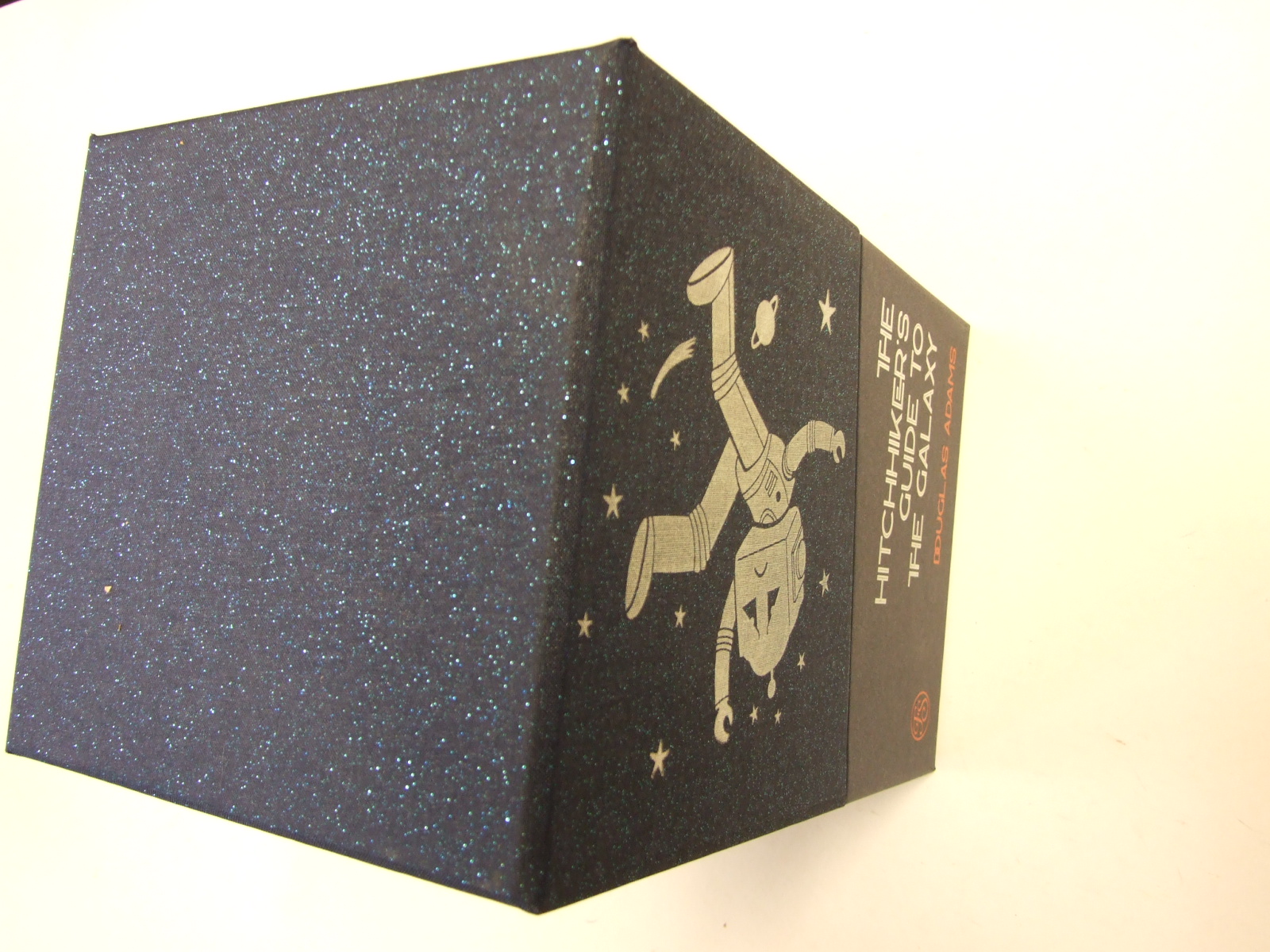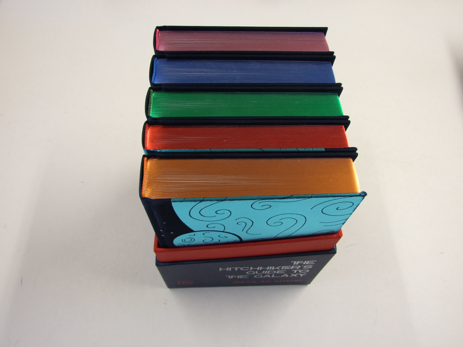 Published in United Kingdom by Folio Society. 2022. First Printing. 5 Fine Hardbacks. No inscriptions or bookplates. Fine box. Illustrated by Jonathan Burton. Introduced by Jonathan Burton. Preface by Carlo Rovelli. Limited to 750 hand-numbered sets of which this is number 133. Including introductions by Terry Jones, Adam Roberts and Jon Canter. The Folio Society limited edition of Douglas Adams's The Hitchhiker's Guide to the Galaxy arrives in a spectacular presentation box with DON'T PANIC written in large, friendly letters on the front. All five volumes feature new illustrations by artist Jonathan Burton. Submission for Kingsbury Press's Canon Book Printer of the Year Award. Five volumes bound in cloth blocked in holographic silver, turquoise, pink, blue, green, red and orange foils. Set in Freight Text with Kavo as display. Printed on Munken Lynx Rough paper. 1,240 pages in total. 44 colour and 30 black & white illustrations in total. Limitation label signed by Jonathan Burton. Metallic foil page-tops. Endpapers printed with a design by the artist. 9.5" x 6.25". Presented in a two-part box covered in cloth and paper blocked with metallic foils and lined with paper printed with silver stars. Print for framing presented in a folder printed with a design by the artist . ISBN: None .
